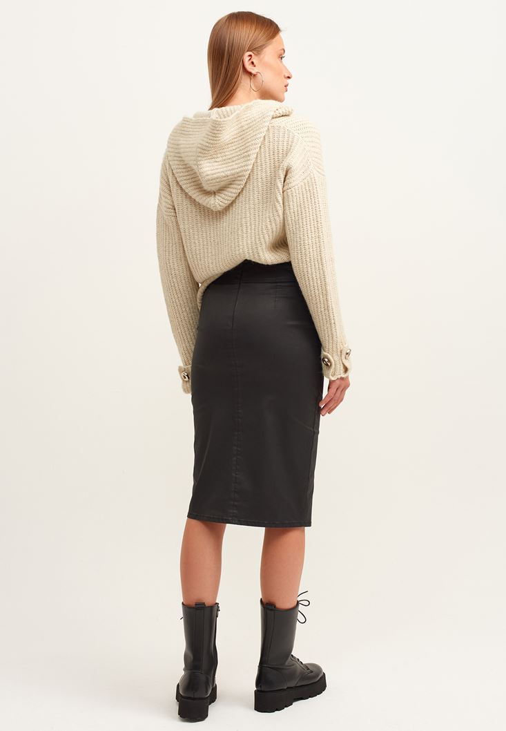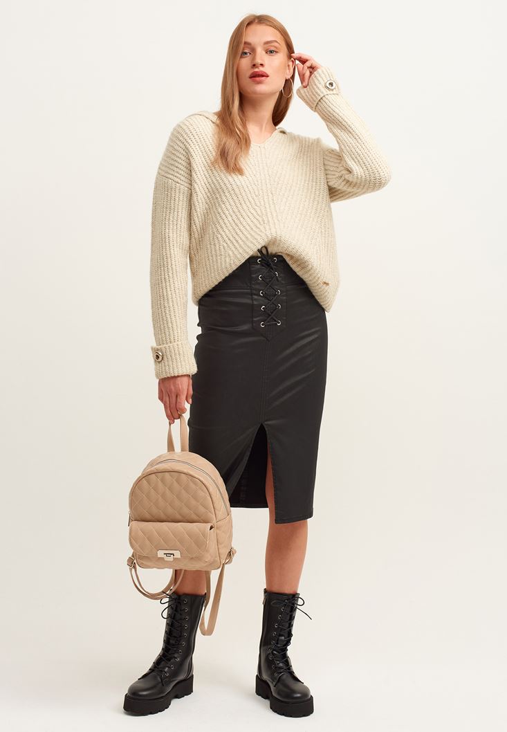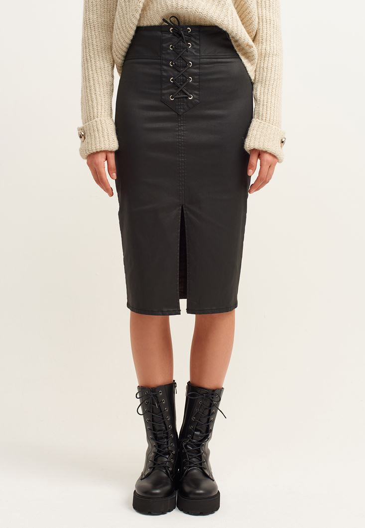 Midi eteklerin gücü adına! Kaplama dokulu bu etek Shadows koleksiyonu ile karşında... Onunla bir an önce buluşarak harikalar yaratacağına eminiz! Midi etek modelinin bağcık detayı ve yüksek bel duruşu ile en sevdiğin uzun çizmeleri bir araya getirebilirsin... Böyle bir kombin seni yeterince havalı gösterirken özel randevularına veya hafta sonu davetlerine dahil olabilirsin... :)