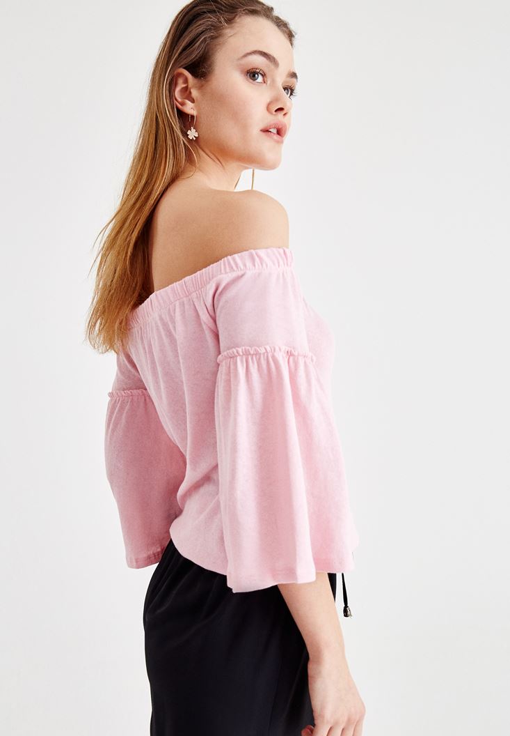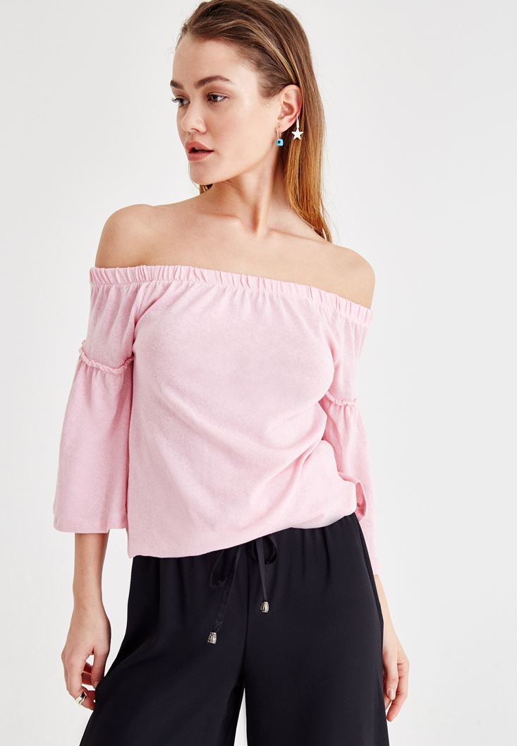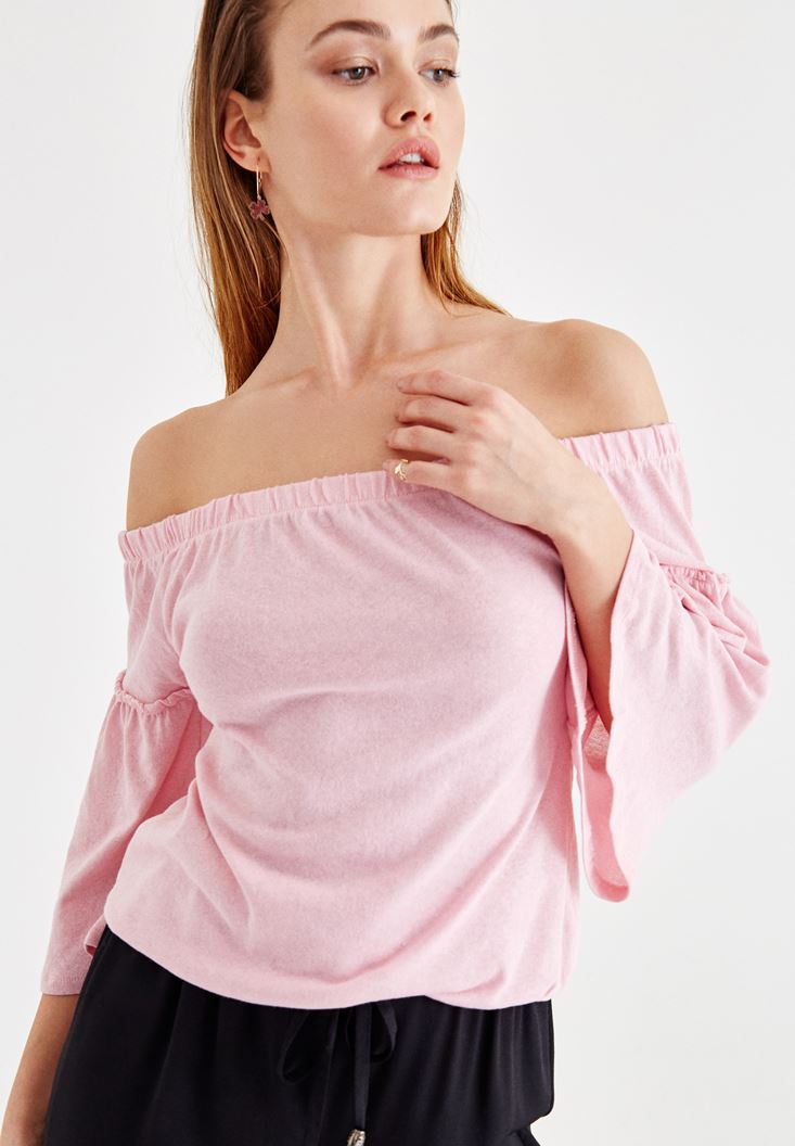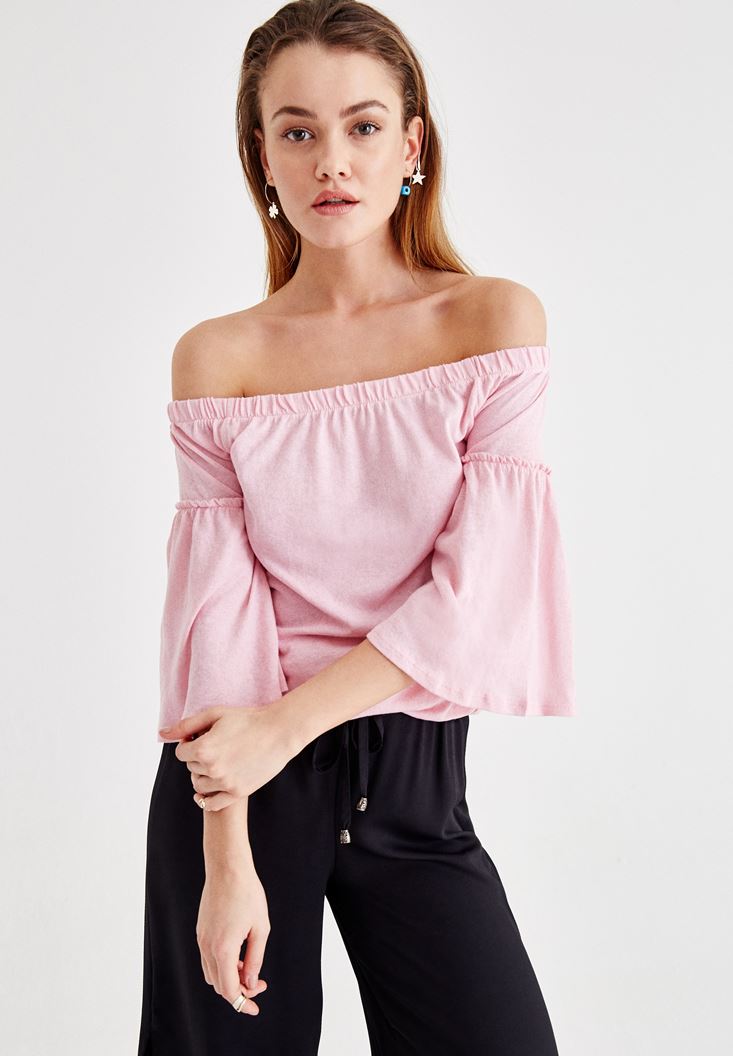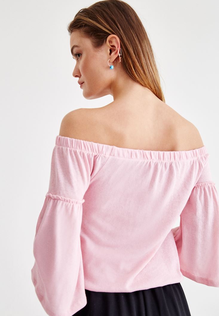 • Bayan Pembe Lastikli Düşük Omuz Bluz