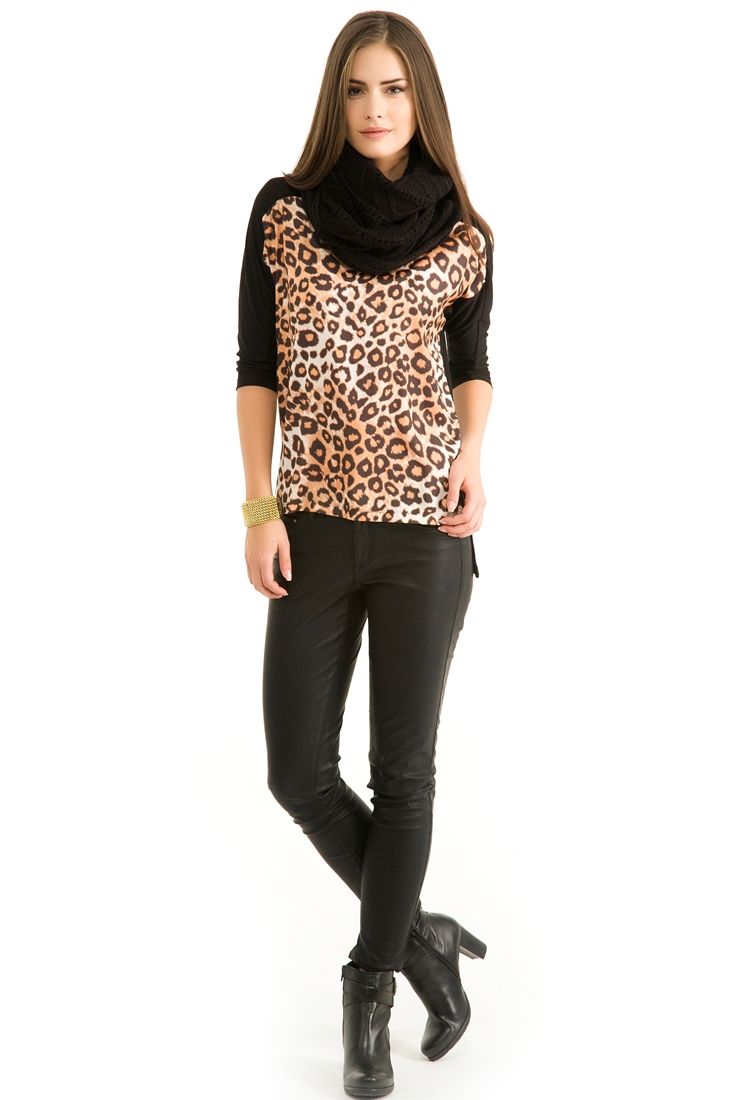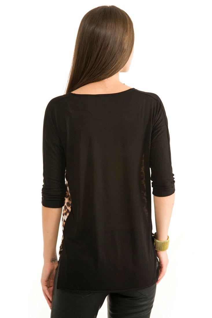 Önü leopar desenli, arkası düz kumaştan, kısa kollu bluz.