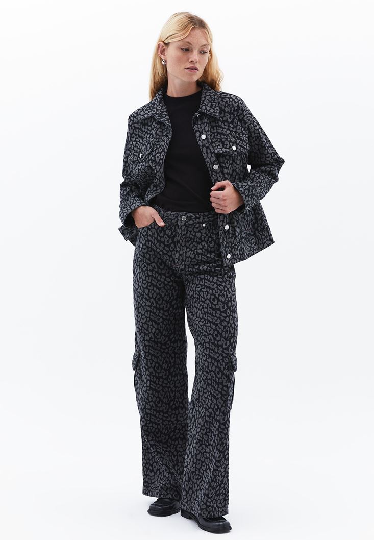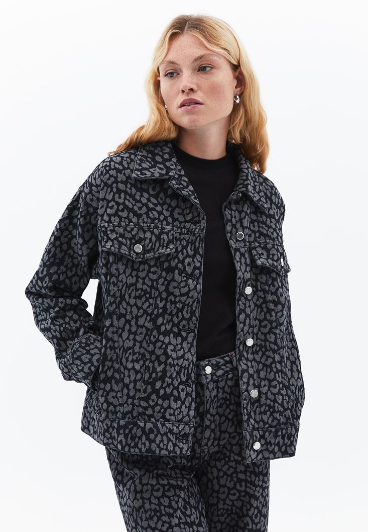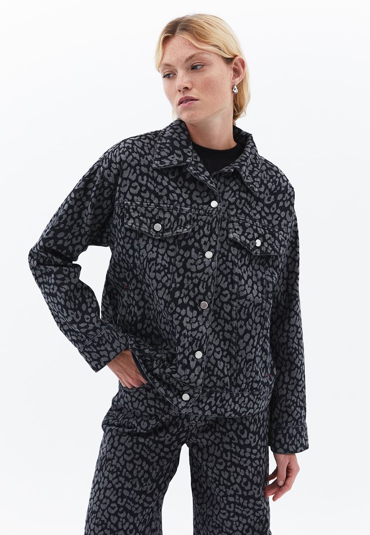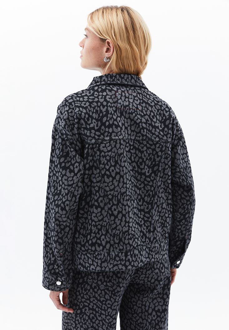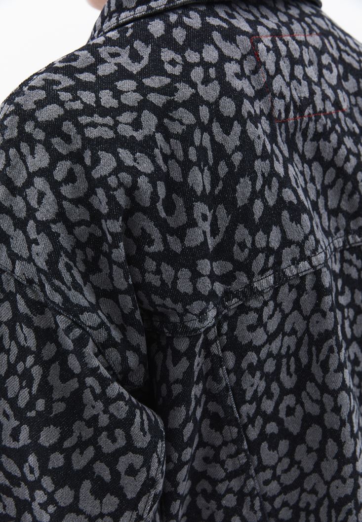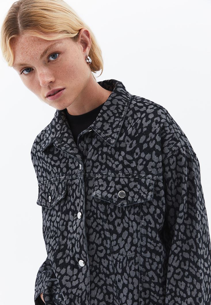 Gri Leopar Desenli Oversize Denim Ceket
