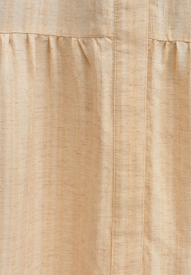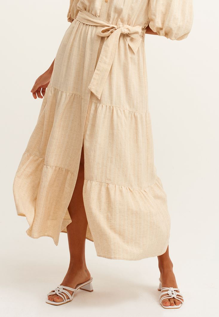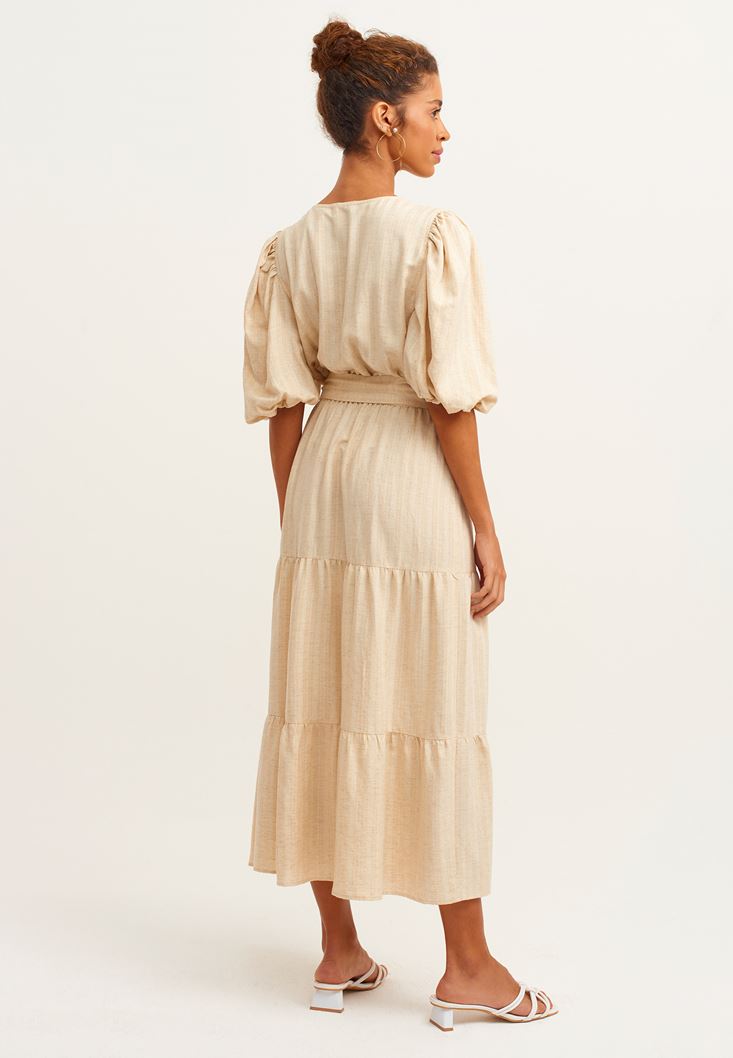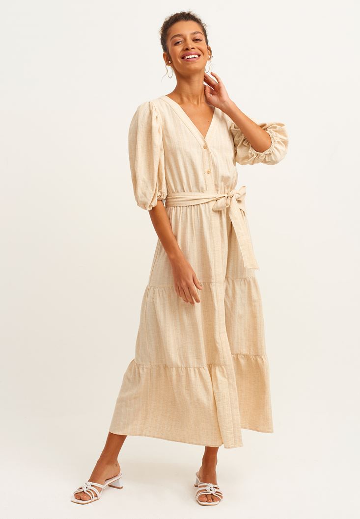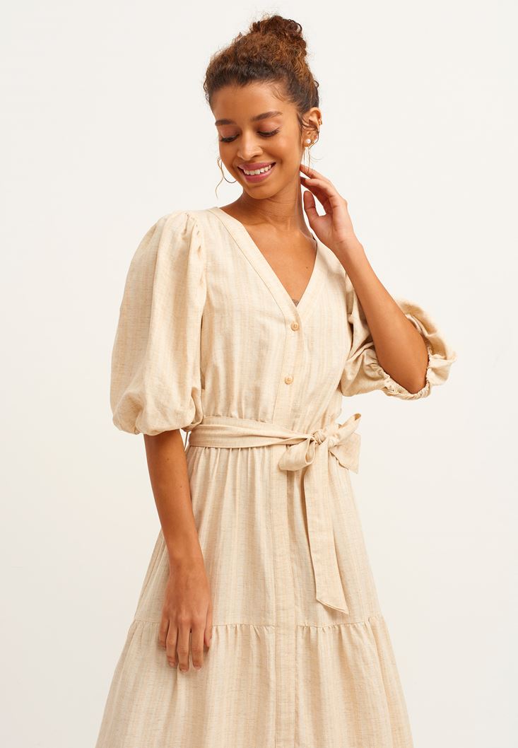 • Bayan Kum Beji Linen Blend Balon Kollu Midi Elbise