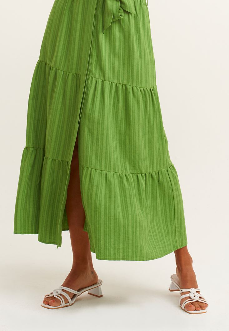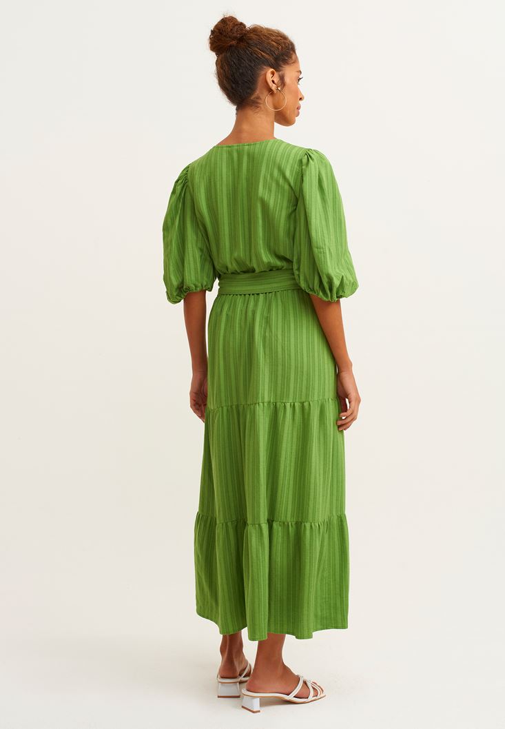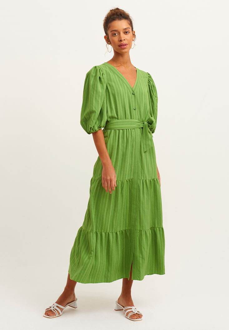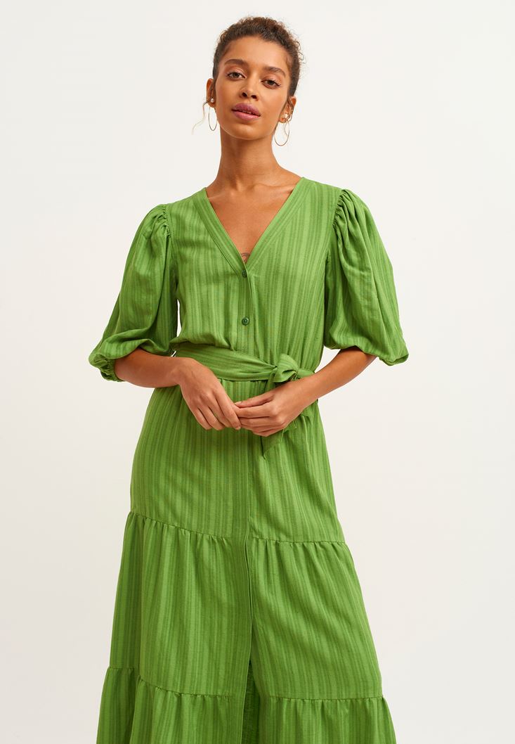 Yeşil Linen Blend Balon Kollu Midi Elbise