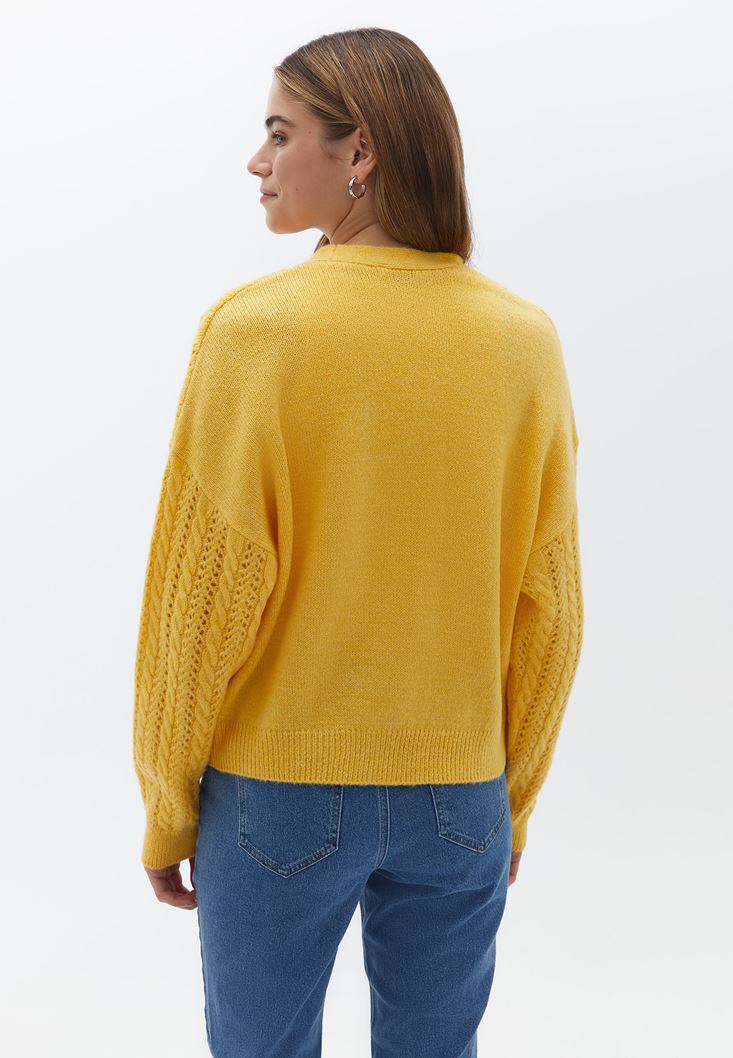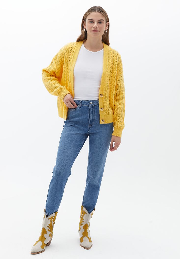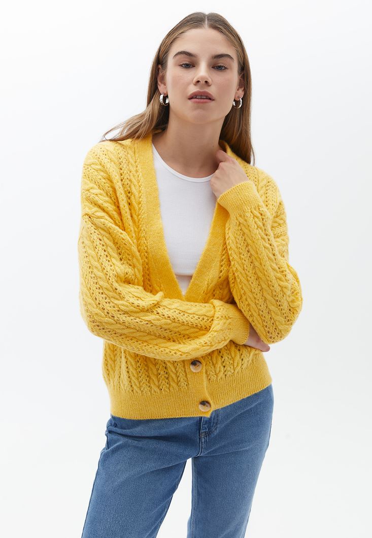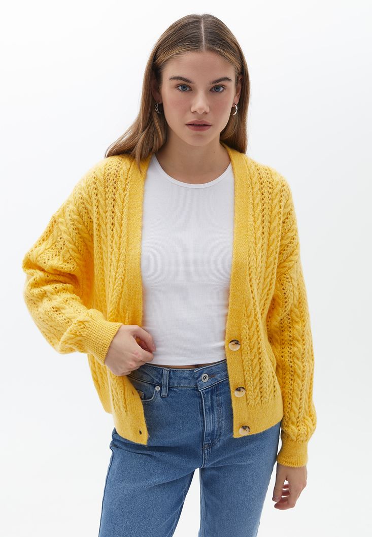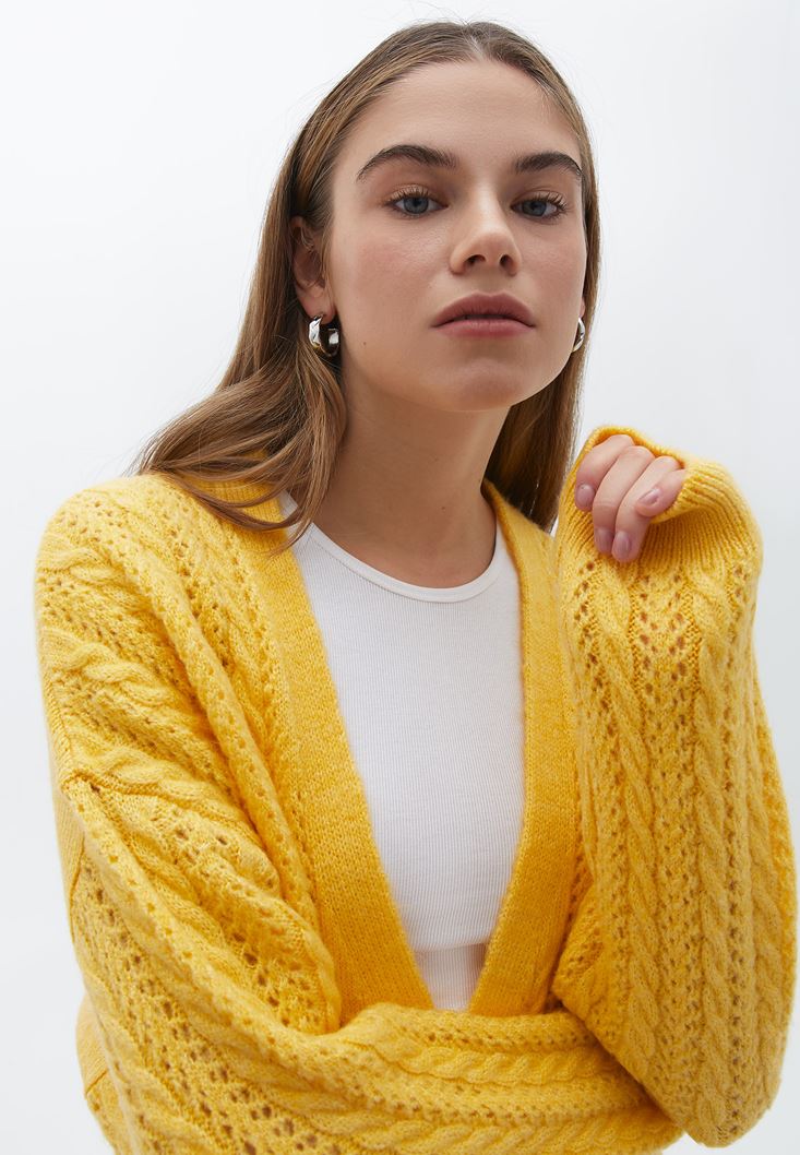 Sarı Loose-Fit Ajurlu Hırka