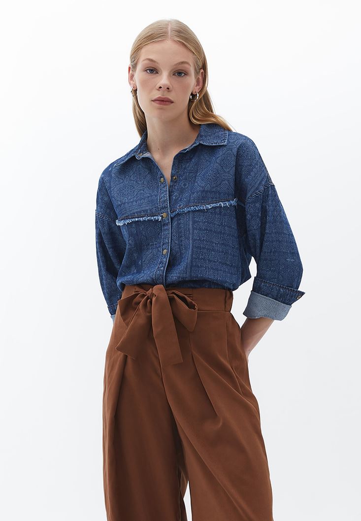 • Bayan Mavi Loose-Fit Baskılı Denim Gömlek