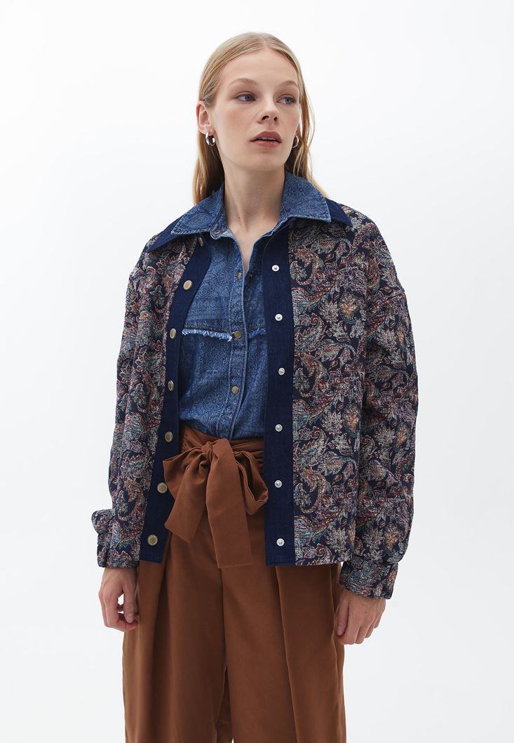 %100 pamuklu denim doku, ön kısmı kısa püskül detaylı, mix desenli görünüm, uzun kollu, bedenden uzak rahat fit, önü kısa arkası uzun asimetrik kesim, çıtçıt kapamalı.