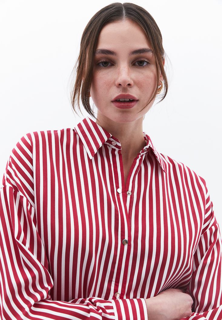 Pamuk içerikli özel doku, çizgi desenli, çıtçıt kapamalı, bedenden uzak oversize kalıp, önü kısa arkası uzun asimetrik kesim, sırt kısmı pileli, uzun kollu.
