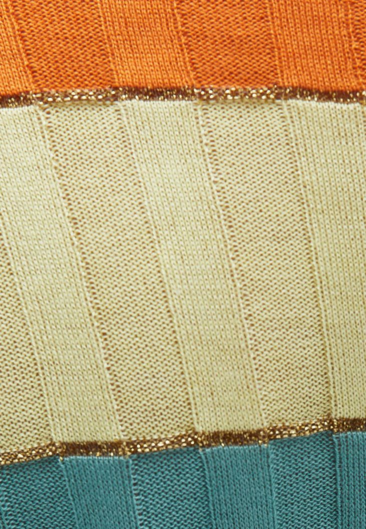 Viskon karışımlı triko, V yaka, uzun kollu, jakarlı örgü, renkli blok desen, parlak örgü detaylı, bedenden uzak rahat fit.