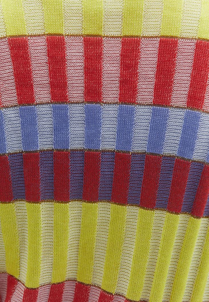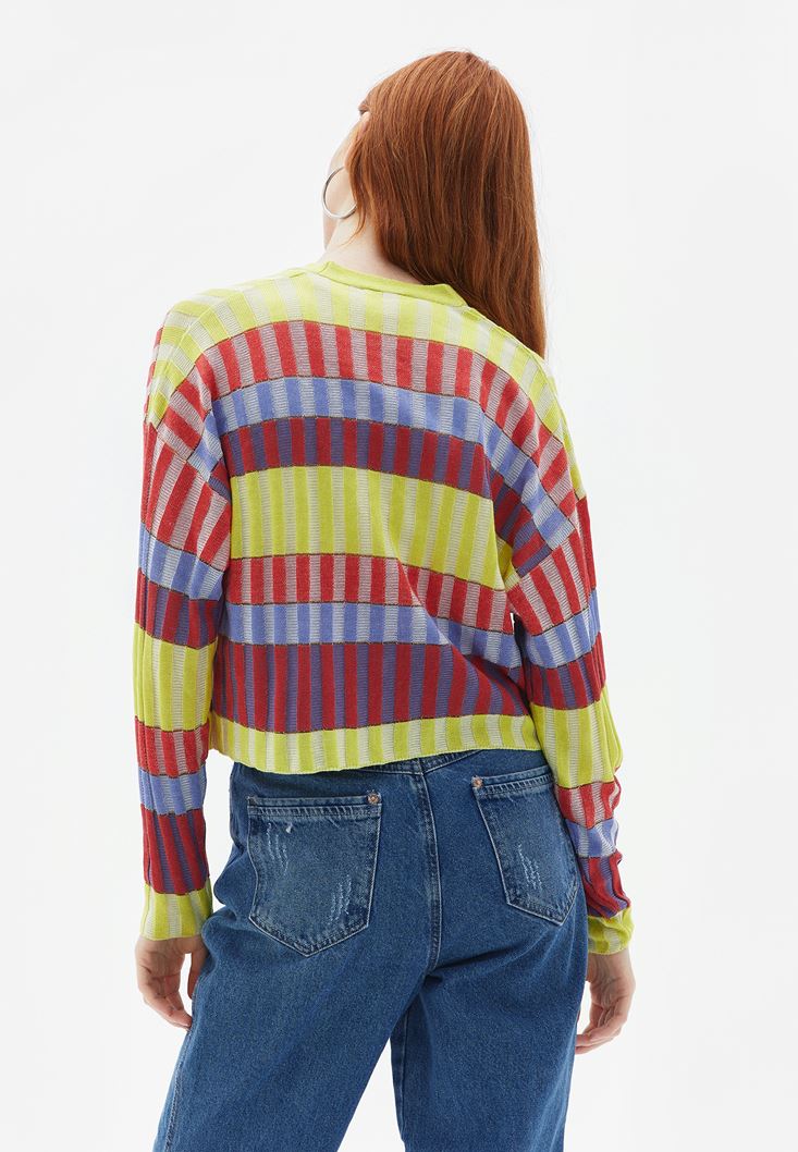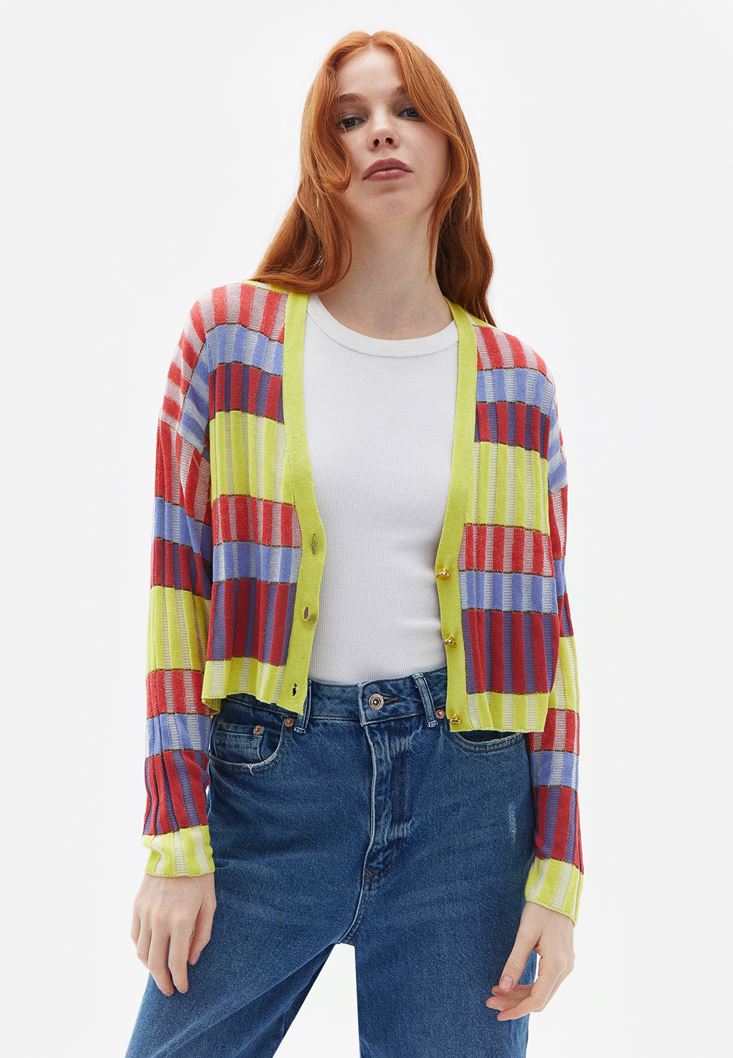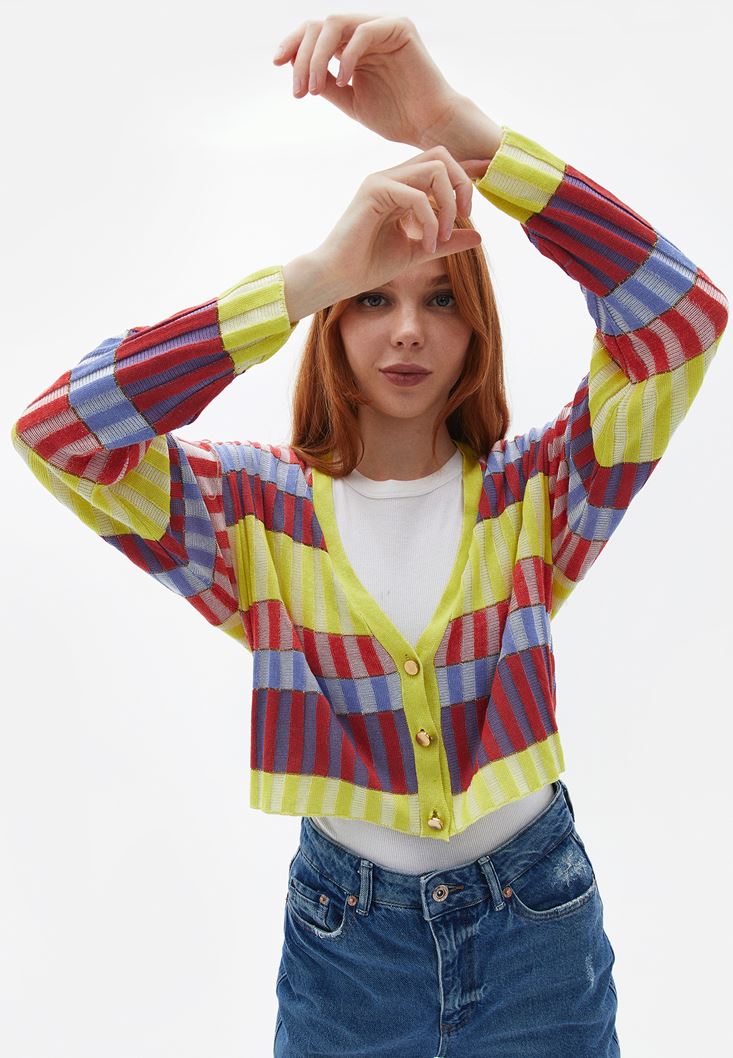 Viskon karışımlı triko, V yaka, bedenden uzak rahat fit, çizgi desenli, düğme kapamalı, crop kesim, uzun kollu.