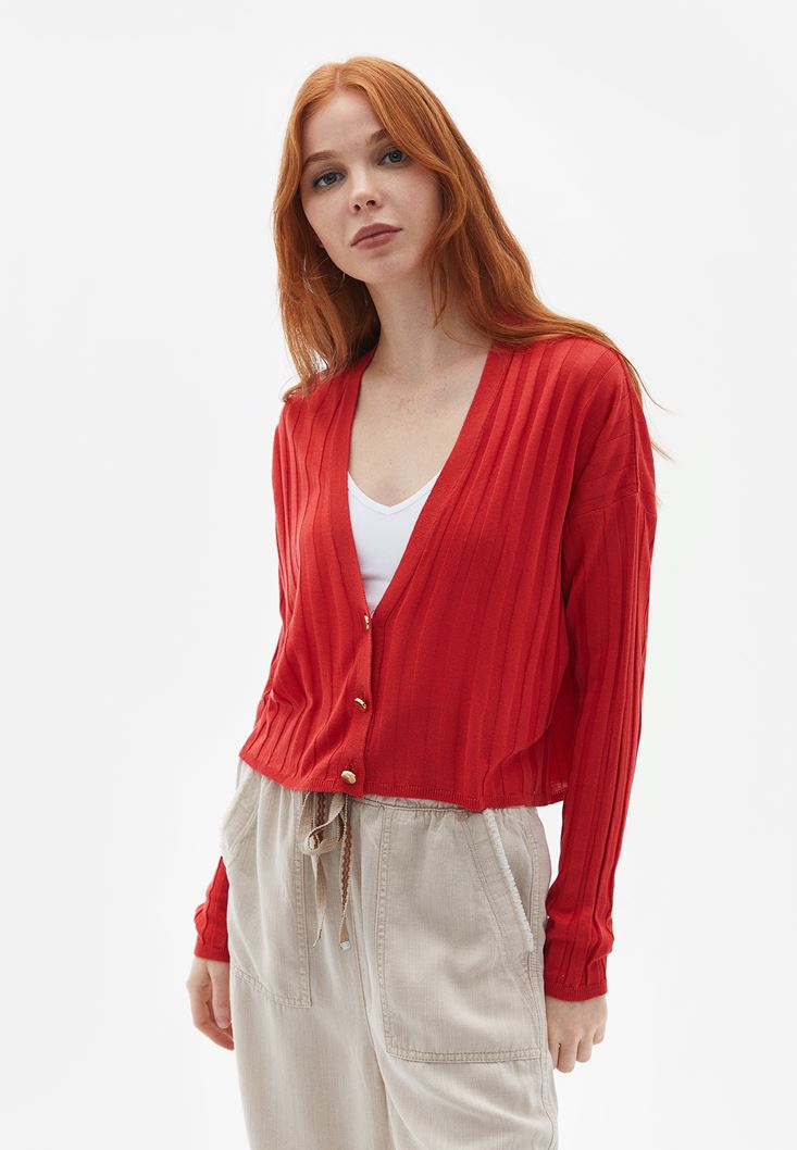 Kırmızı Loose-Fit Düğmeli Hırka