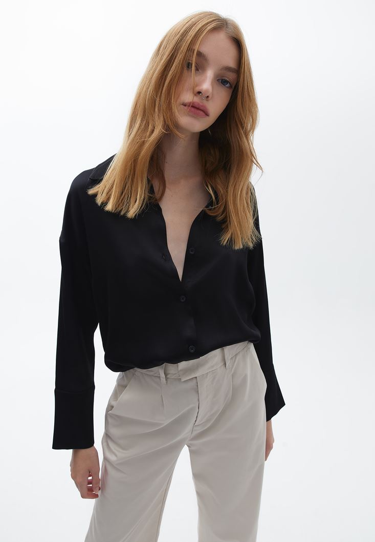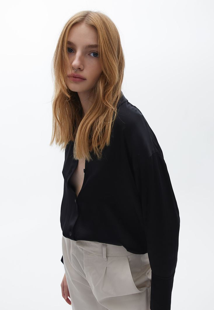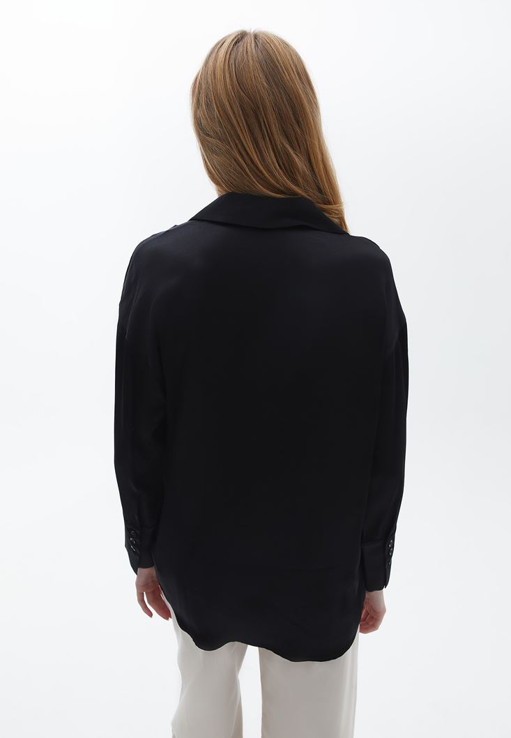 • Bayan Siyah Loose-Fit Saten Gömlek