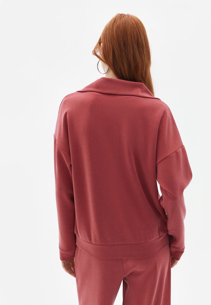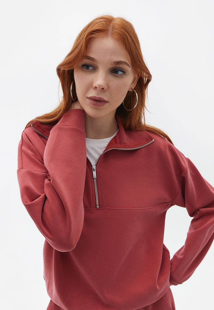 Modal karışımlı yumuşak doku, bedenden uzak rahat fit, uzun kollu, fermuarlı yüksek yaka.