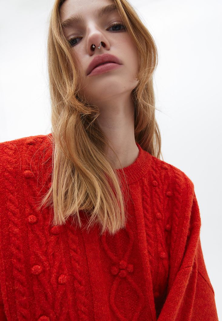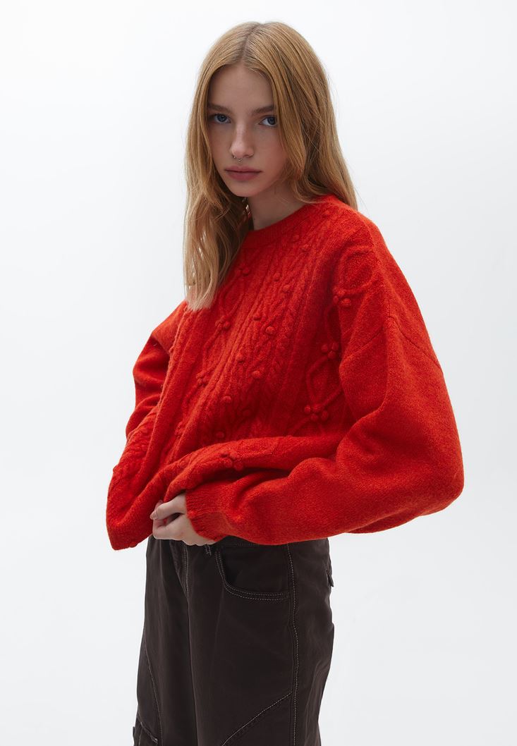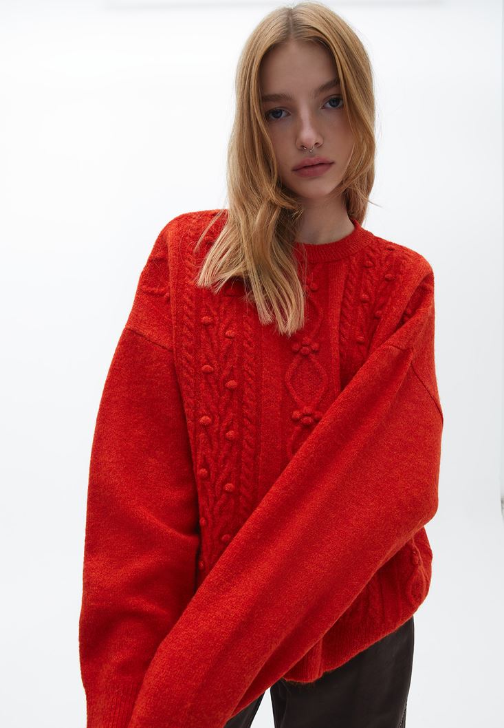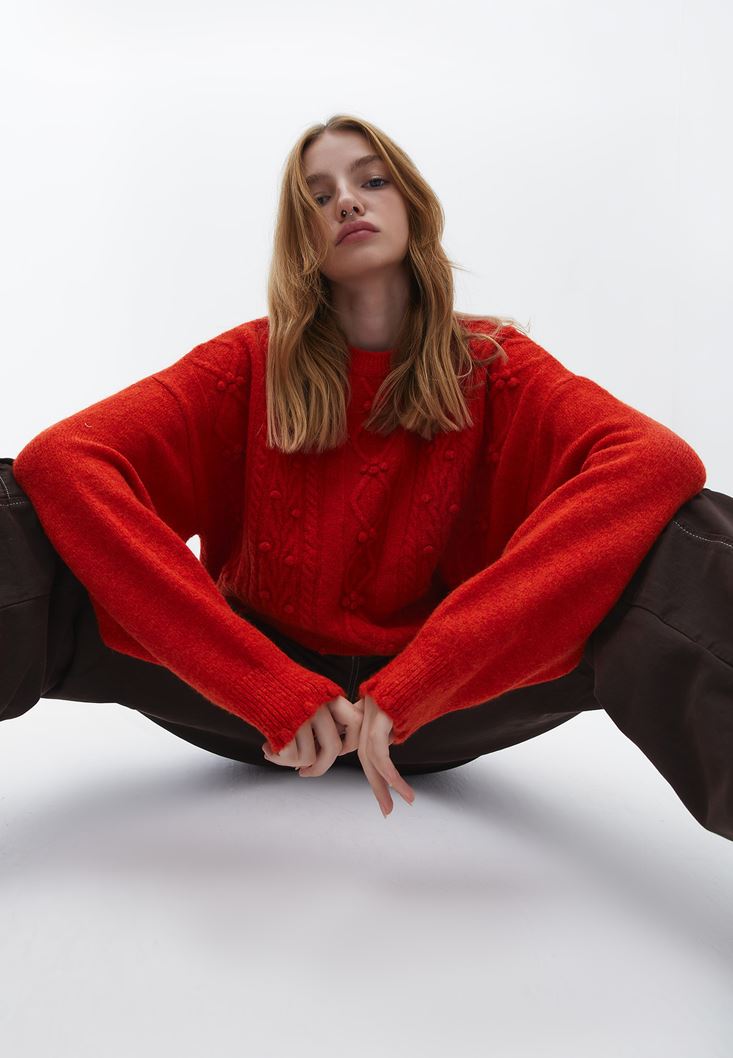 Saç örgüsü ve ponpon detaylı örgü, sıfır yaka, uzun kollu, bedenden uzak loose fit, standart boy.