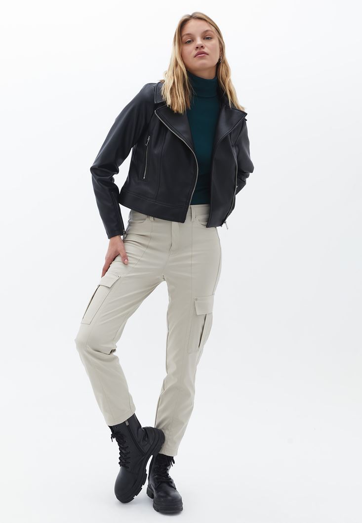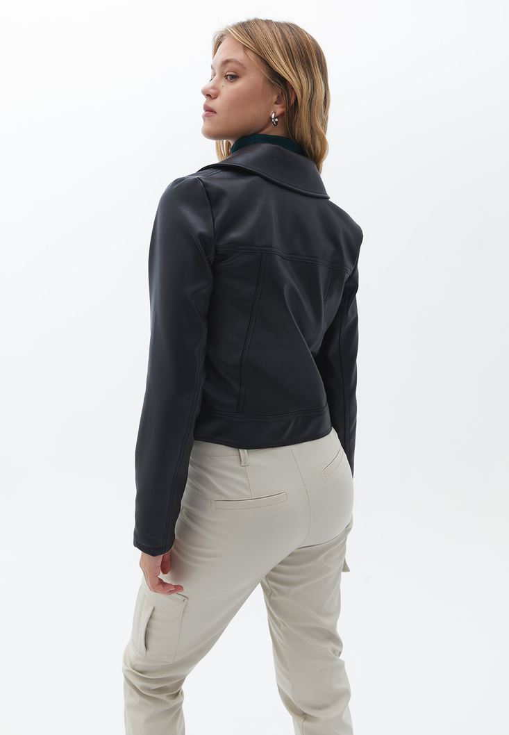 Vegan deri doku, bedene yakın fit, fermuar kapamalı, kısa boy kesimi,  içi astarlı, ön kısmı iki cepli, asimetrik yaka.