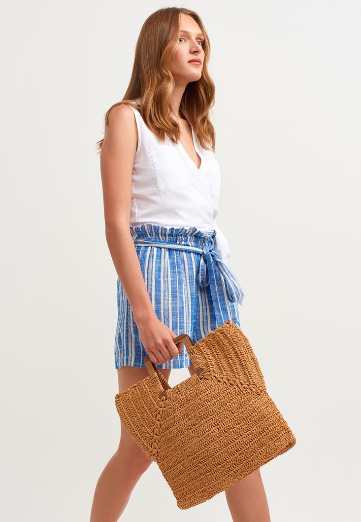 Makrome Çanta modeli. Kusursuz örgü detayı ile birleşen kare şeklindeki kulp görünümü bu sezona farklılık katmak için hazır... Kadın çanta modelinin nostaljik duruşunu sahilde veya yaz akşamlarında kombinlerine dahil etmen mümkün. Senin için en iyi tamamlayıcı parçalardan biri olan kadın çanta modeli ile sandaletleri veya topuklu terlikleri buluşturmak fazlasıyla etkileyici!