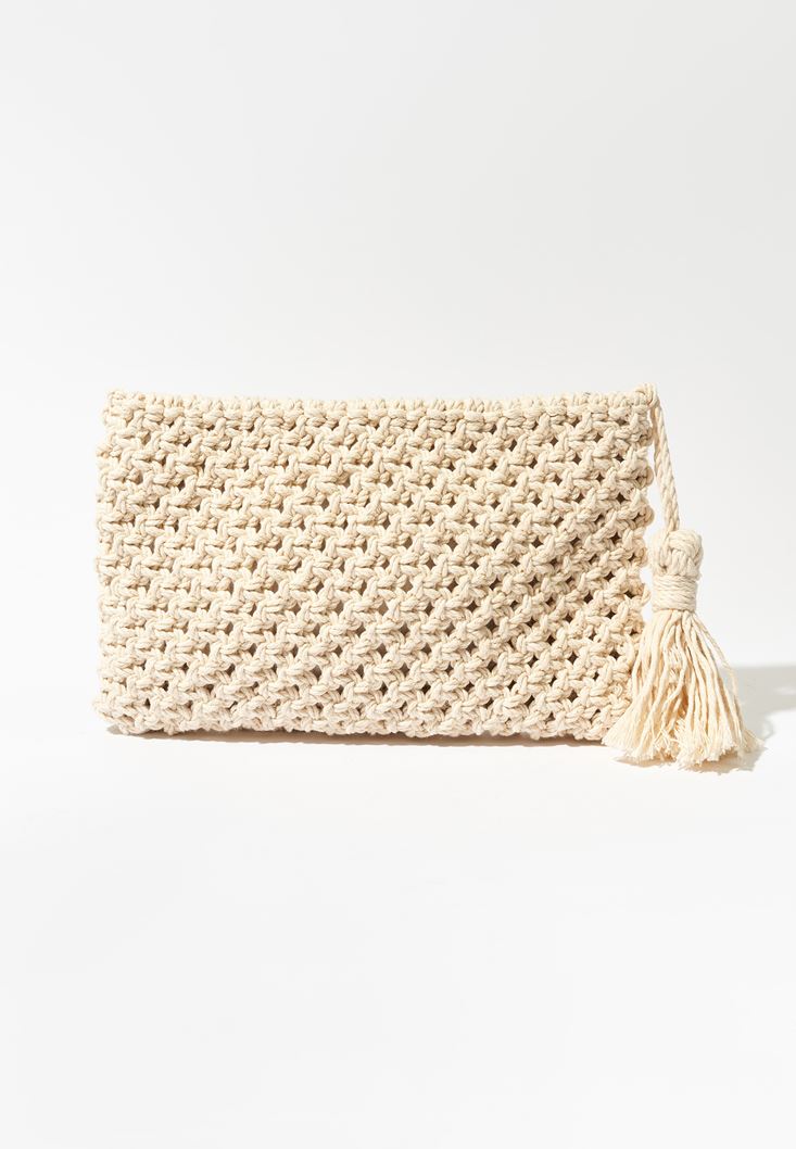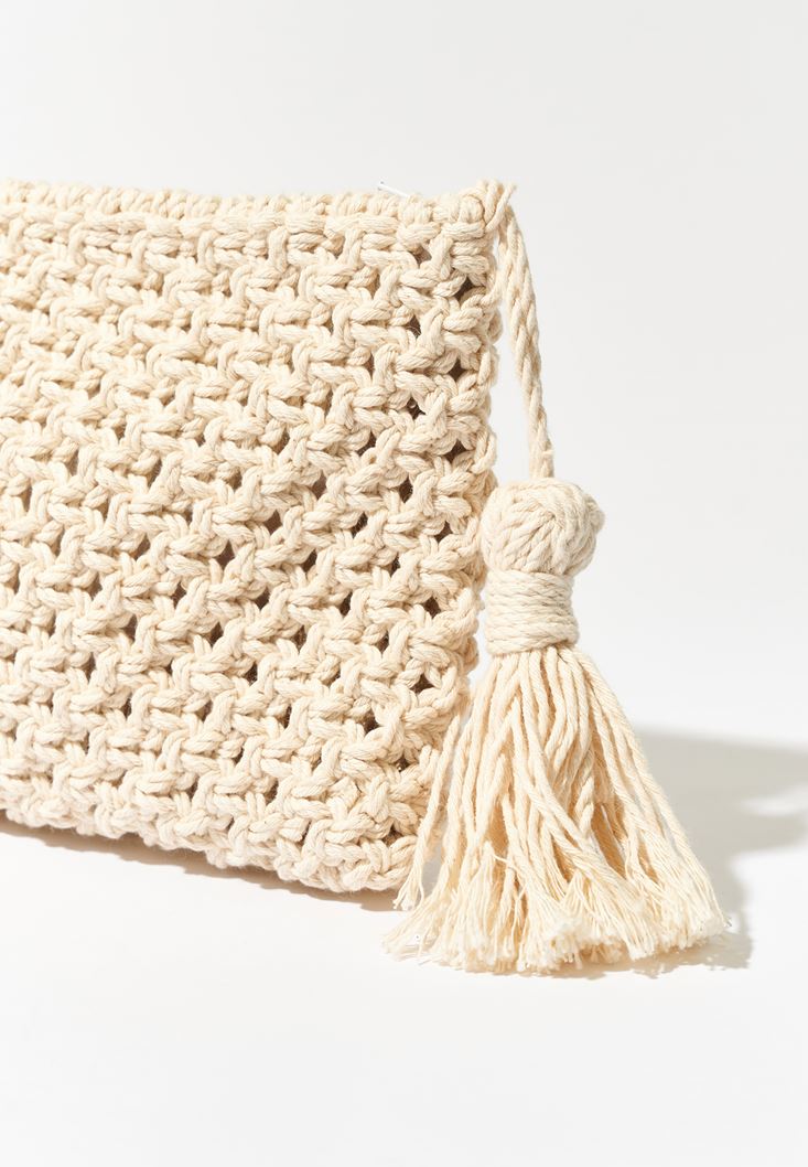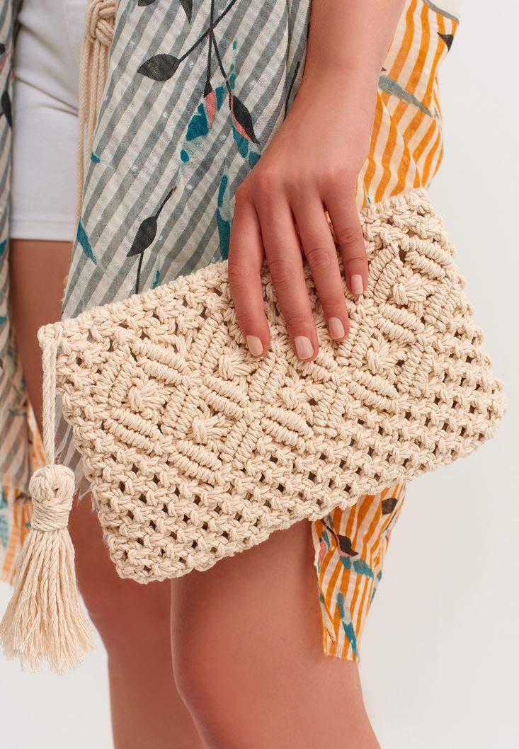 Makrome Örgü Clutch modeli. Motifli örgü ayrıntısıyla karşına çıkan çanta ile bir an önce tanışman gerek! Büyük püskül detayının hareketliliği ve makrome örgünün hoş görünümü senin için bir arada... Askılı elbiselerle veya mini şortlarla oluşturacağın kombinleri, clutch modeli ile yükselişe geçirerek doğaya kucak açman mümkün!