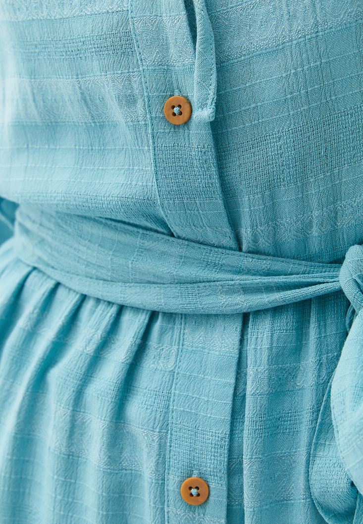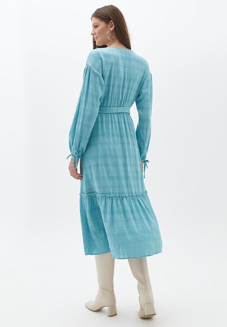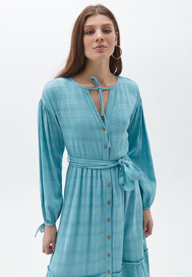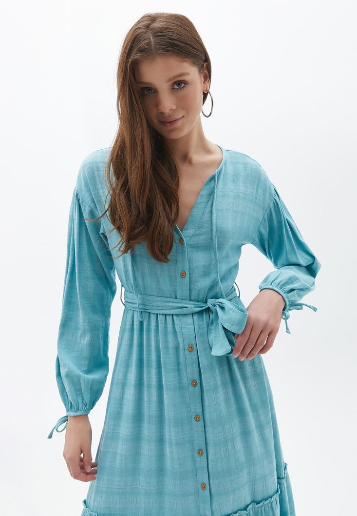 Pamuk ve viskon karışımlı doku, bedenden uzak rahat fit, uzun kollu, kol ucu ve yakası bağcıklı, kendi kumaşından kuşaklı, düğme kapamalı, etek ucu volanlı, ince askılı iç astar.
