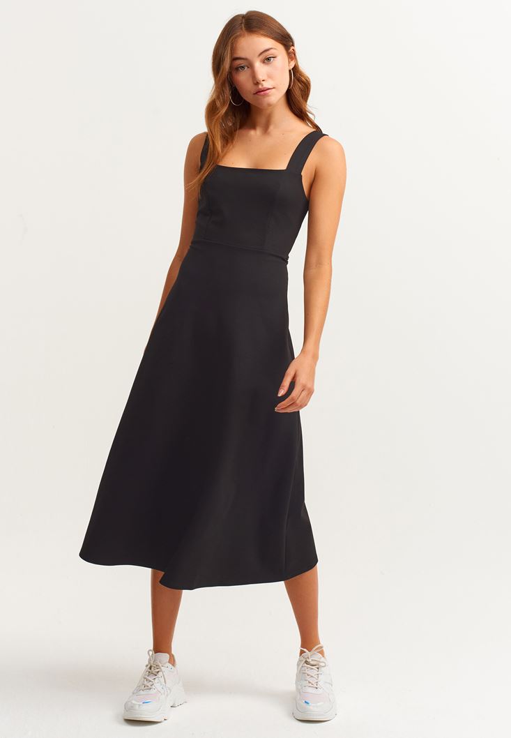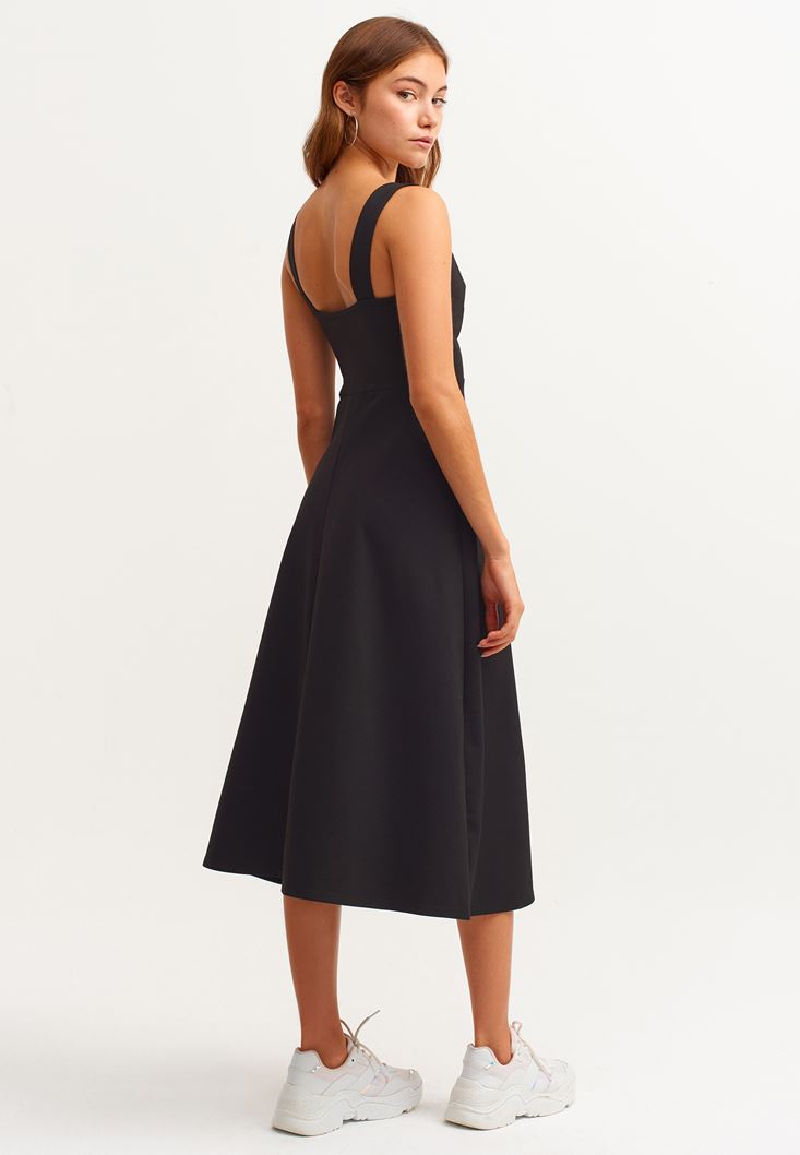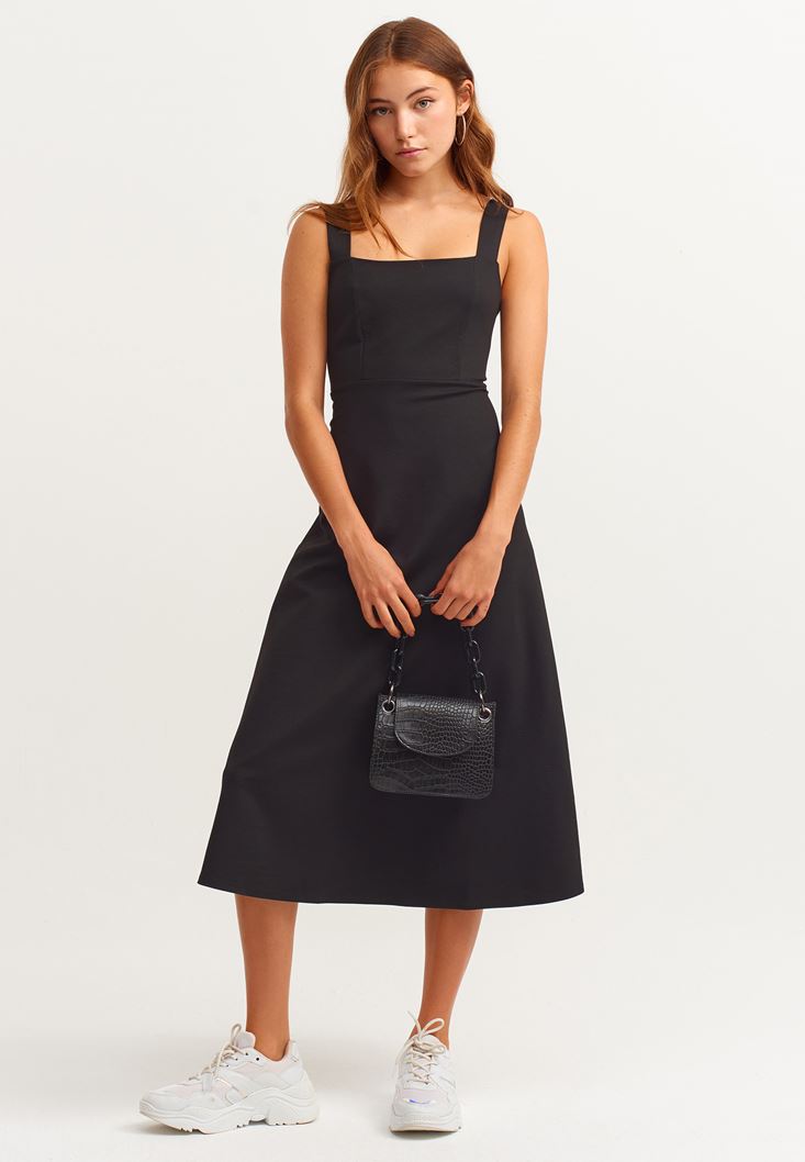• Bayan Siyah Midi Boy Kalın Askılı Elbise