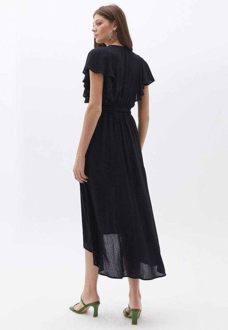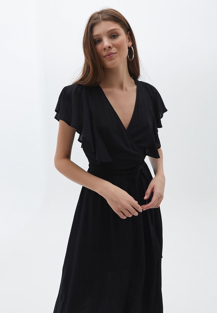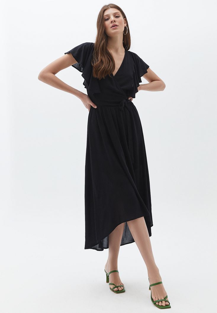 • Bayan Siyah Midi Boy Kruvaze Elbise