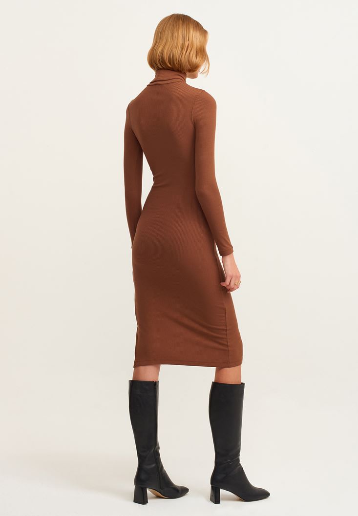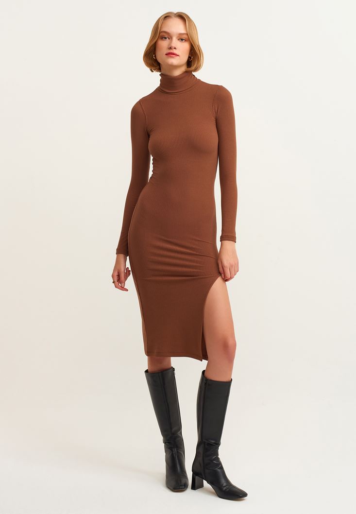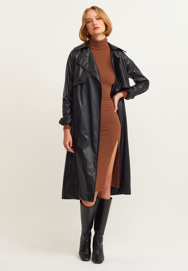 Midi Boy Triko Elbise ve Cepli Yağmurluk Kombini