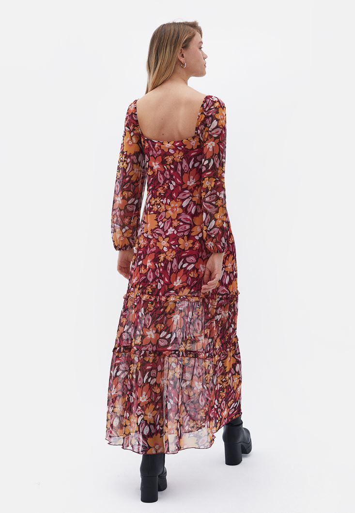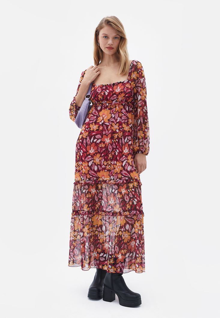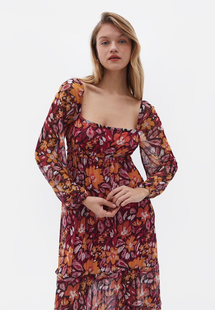 A kesim etek, kare yaka, uzun kollu, midi boy, desenli, kol ucu lastikli, katlı etek tasarımı, içi astarlı.