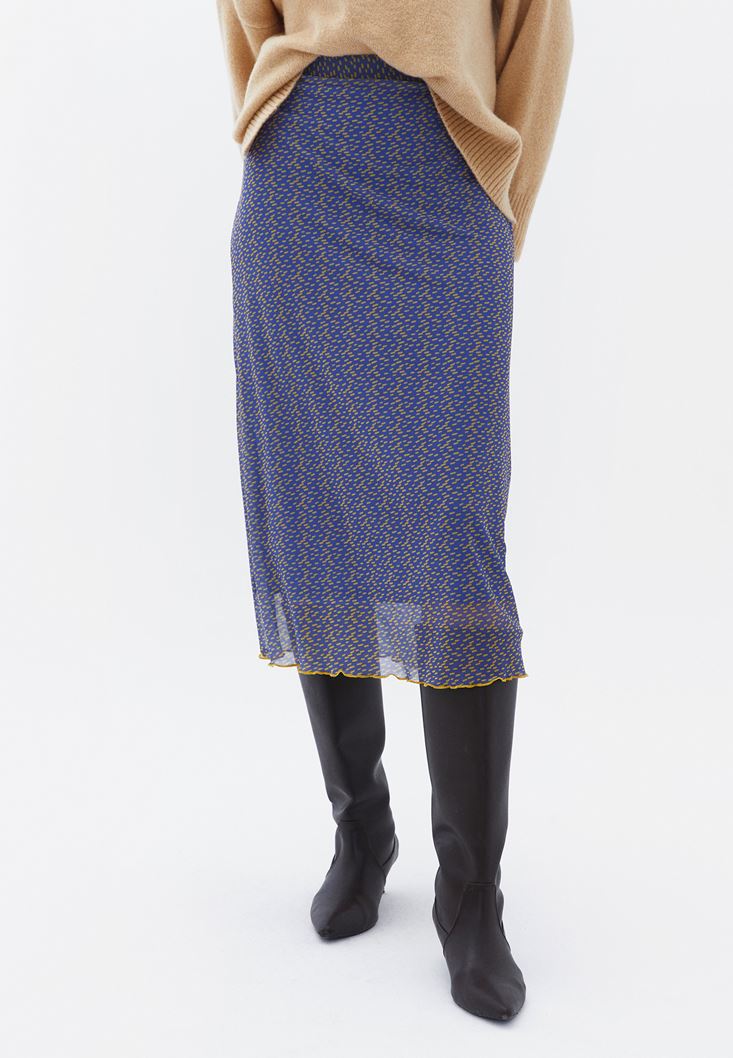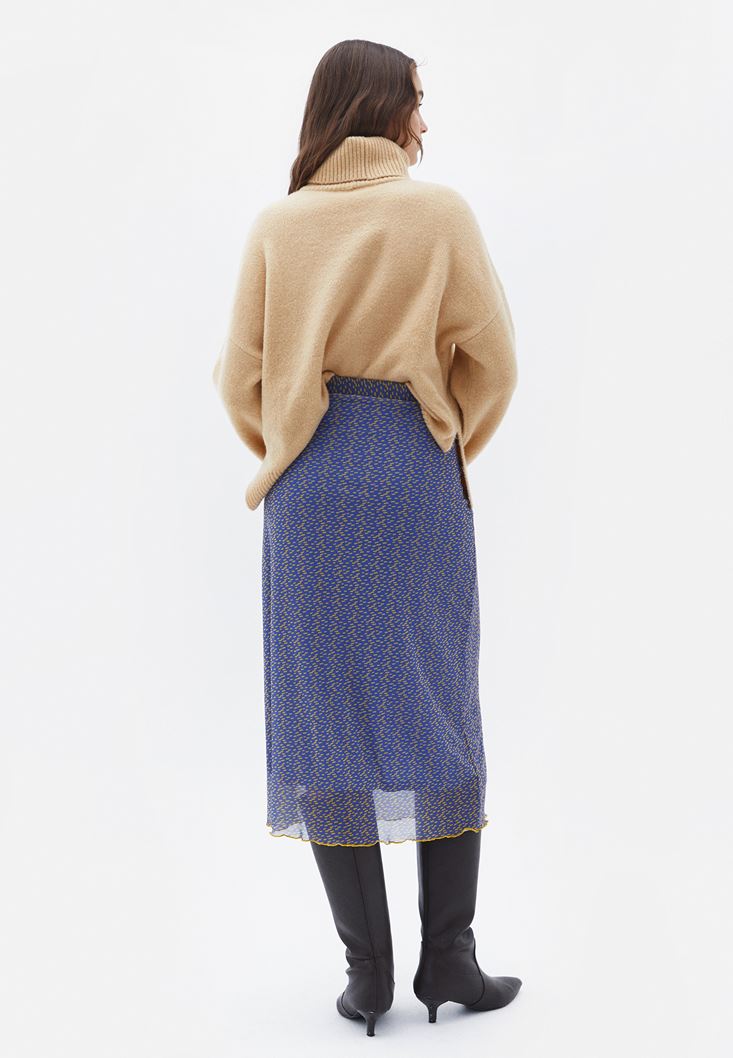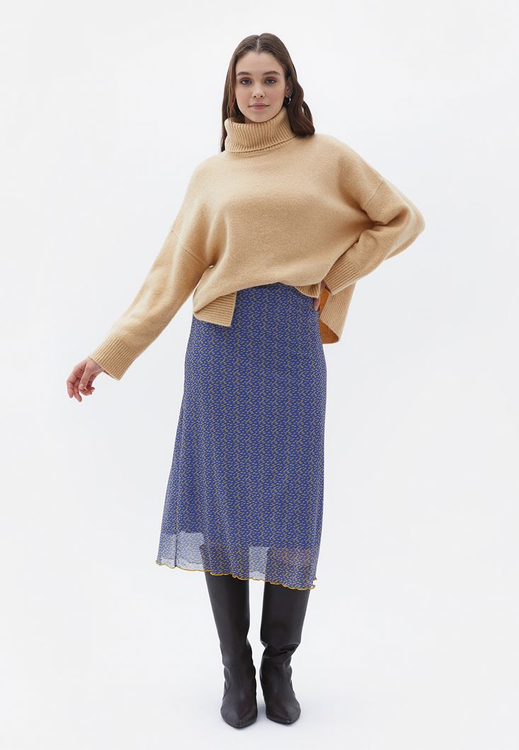 Çiçek desenli transparan doku, içi astarlı, beli lastikli, yüksek bel, midi boy, bedene yakın rahat fit.