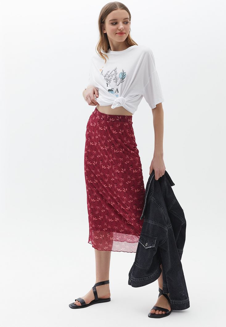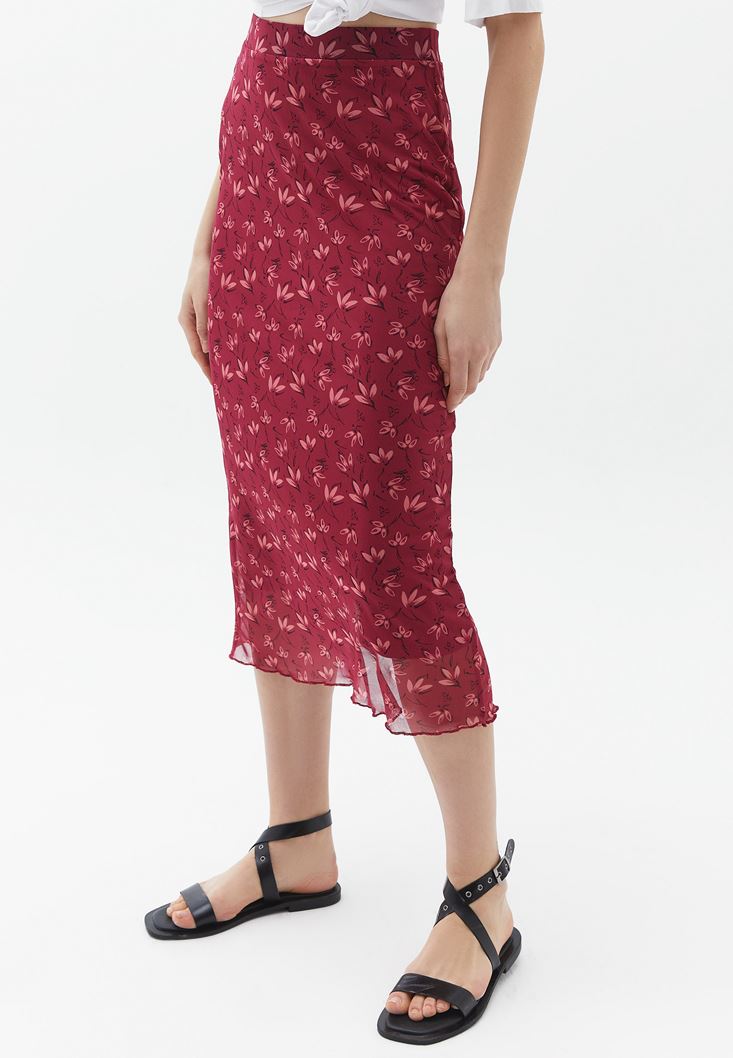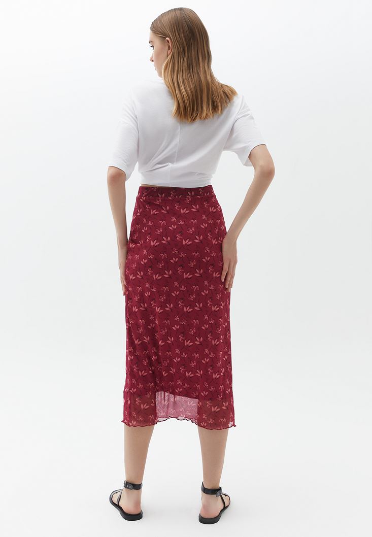 Çiçek desenli transparan doku, içi astarlı, beli lastikli, yüksek bel, midi boy, bedene yakın rahat fit.