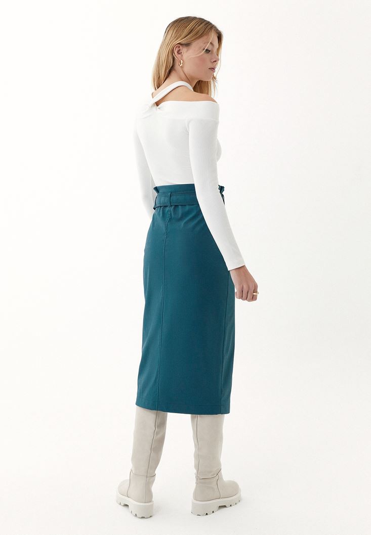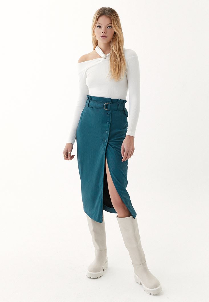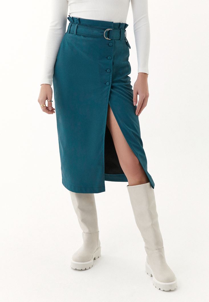Özel dokulu kumaş, yüksek bel, midi boy, yırtmaçlı form, düğme kapamalı, kendi kumaşından kemerli, bedene yakın fit, ön kısmı iki cepli.