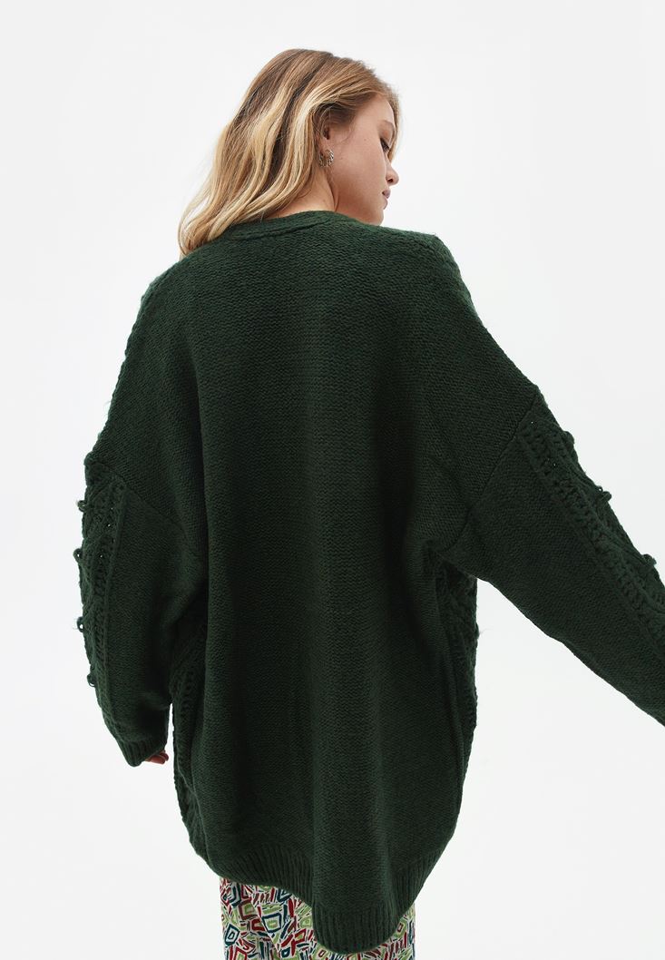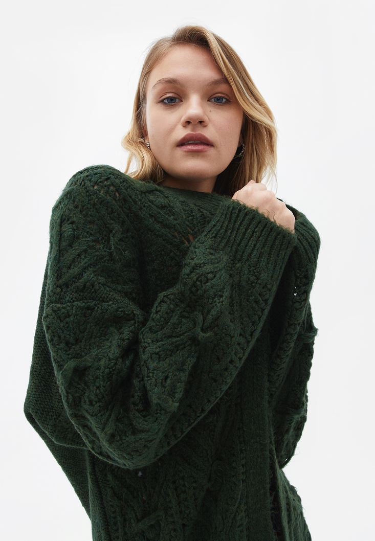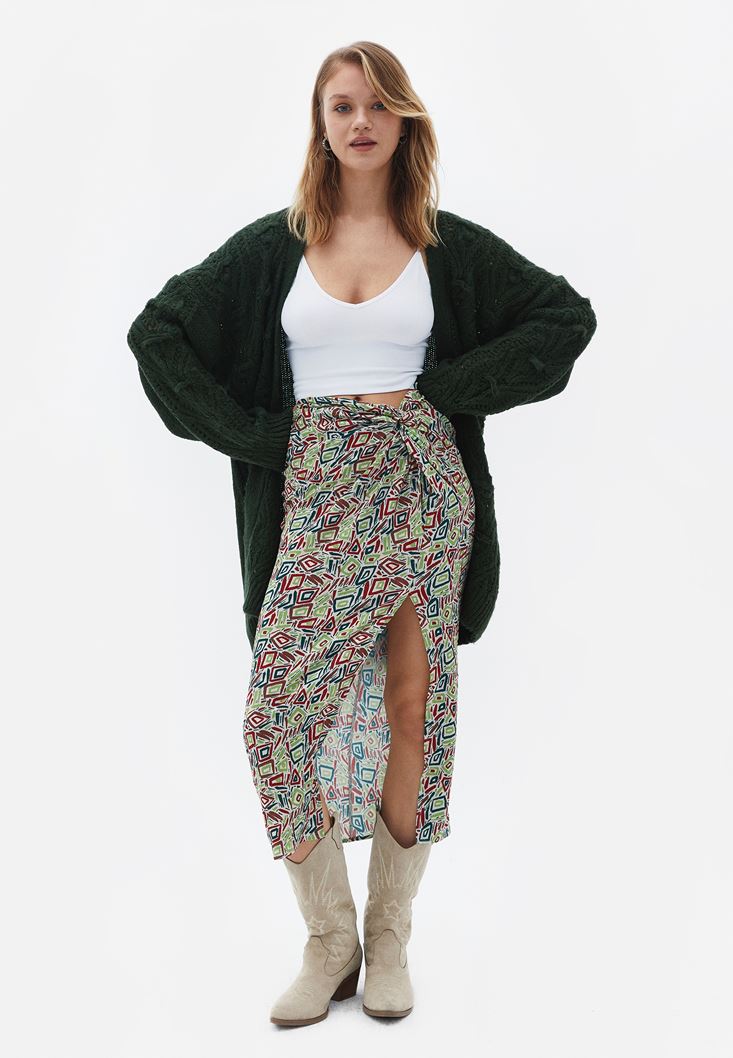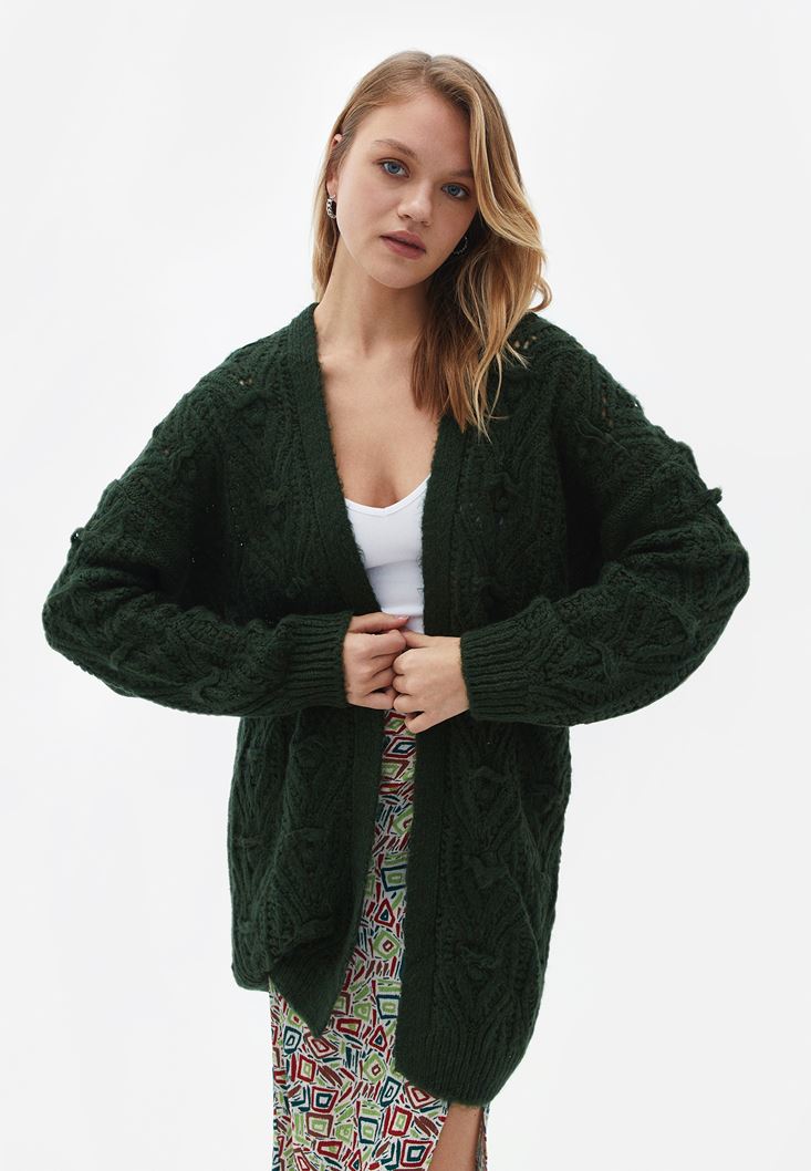 Motifli örgü detaylı triko, midi boy, uzun kollu, bedenden uzak rahat fit.