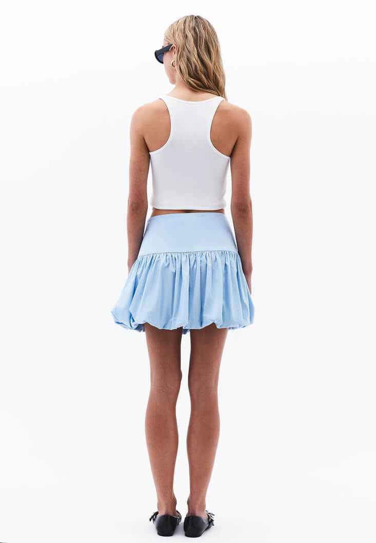 Hacimli formu ve yüksek bel kesimiyle öne çıkan bu balon etek, modern şehir stiline dinamik bir hava katıyor. Belden oturan yapısı siluetinizi vurgularken, etek ucundaki volümlü balon form özgün ve dikkat çekici bir görünüm sunuyor.