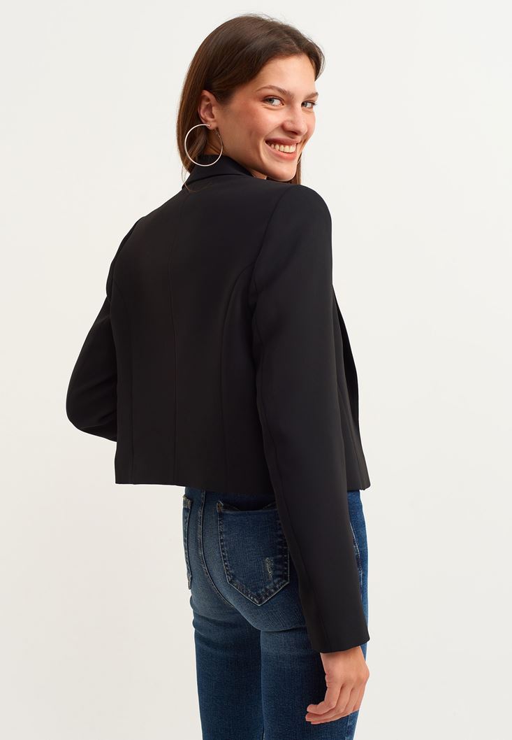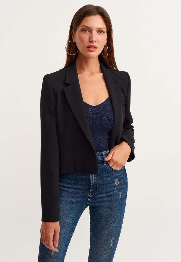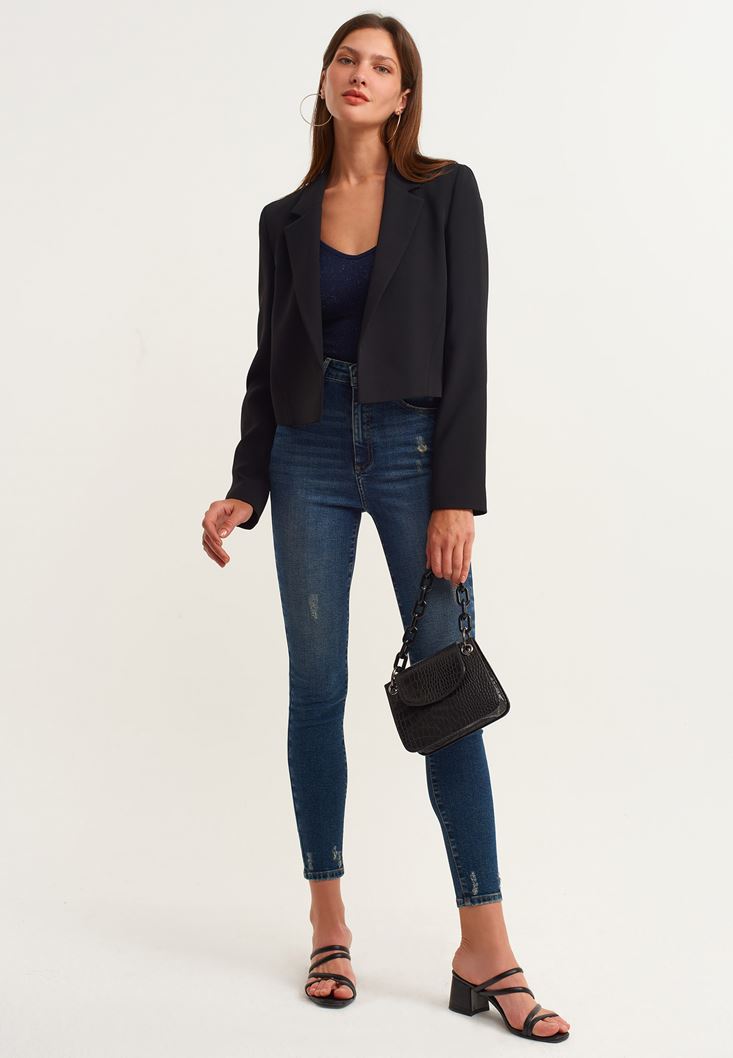 İşte şimdi sıra dışı bir blazer ile tanışma zamanı! Standart blazer kalıbının dışına çıkarak fark yaratan bu parça ile kendi özgürlüğünü yakala... Hoş dokusu ve hafif bol kalıbı ile günlük kombinlerinde veya akşam katılacağın eğlenceli davetlere onunla dahil olabilirsin... Crop blazer ceket modelinin yanında ihtiyacın olan bir büstiyer ve jean! Favorilerin arasında yerini alabilecek olan bu crop blazer ceket ile hem iş hem de davetler için "ne diyeceğim?" diye düşünmek artık sana çok uzak! :)