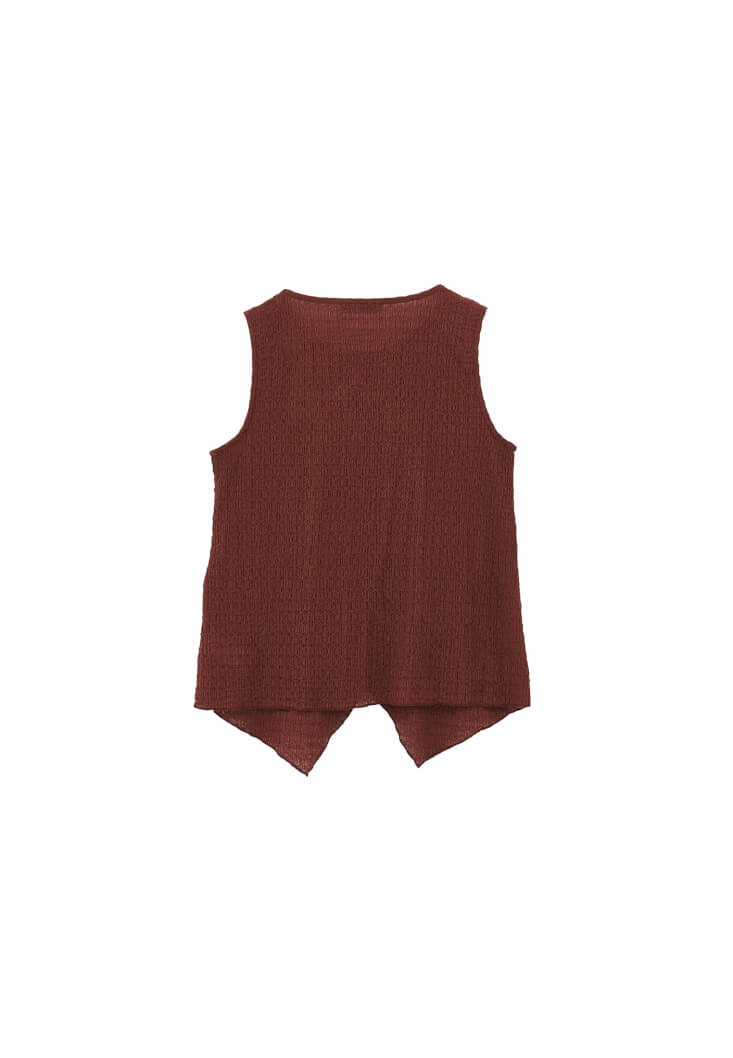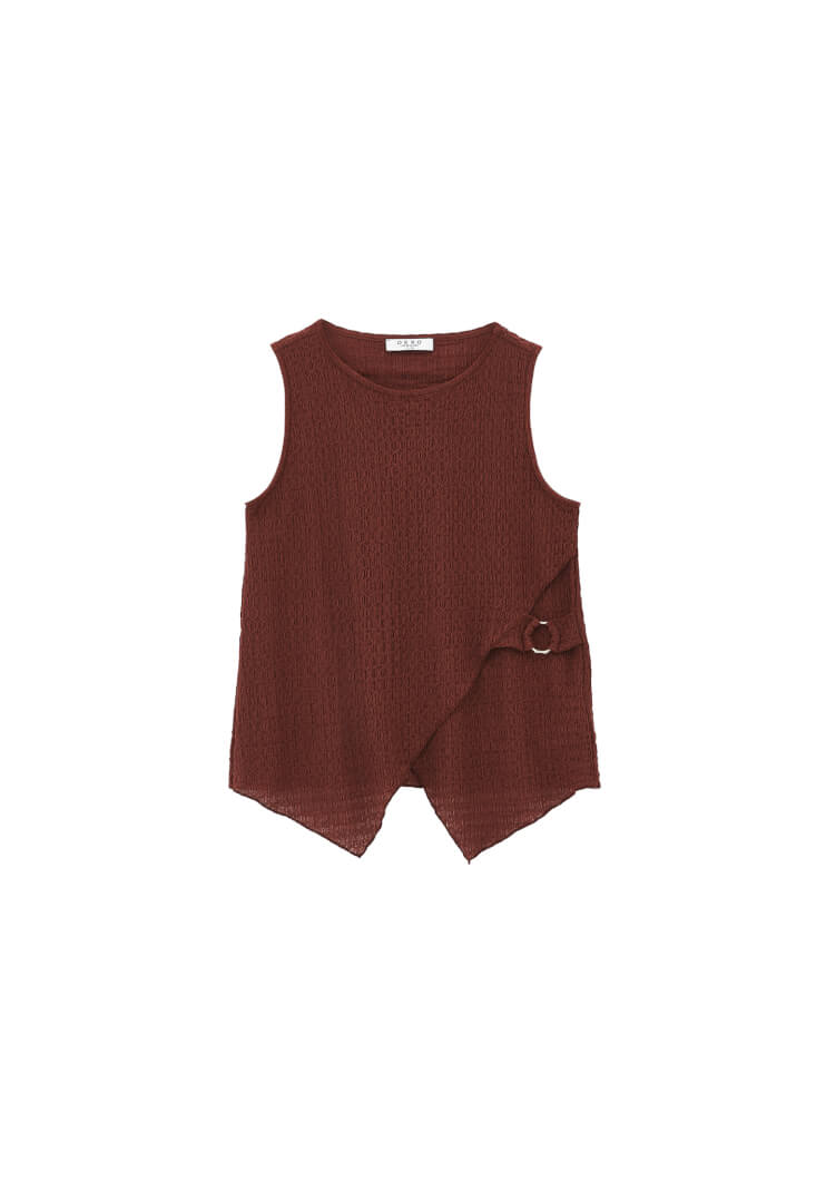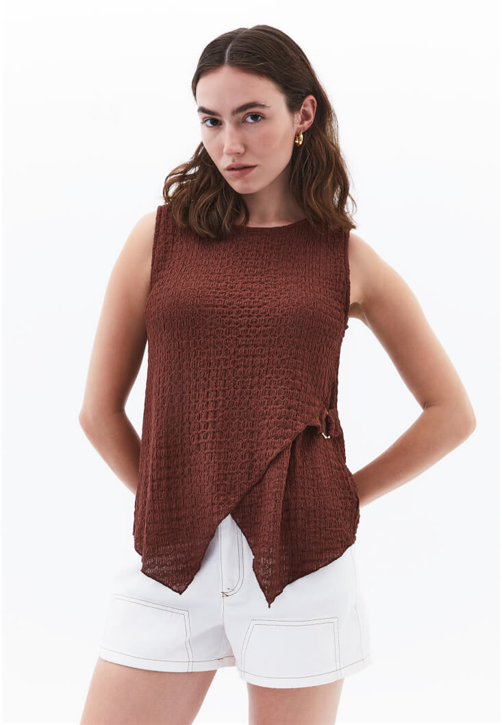 Modal karışımlı gofre doku, bedenden uzak loose fit, sıfır yaka, kolsuz tasarım, etek kısmı toka ve kruvaze detaylı.