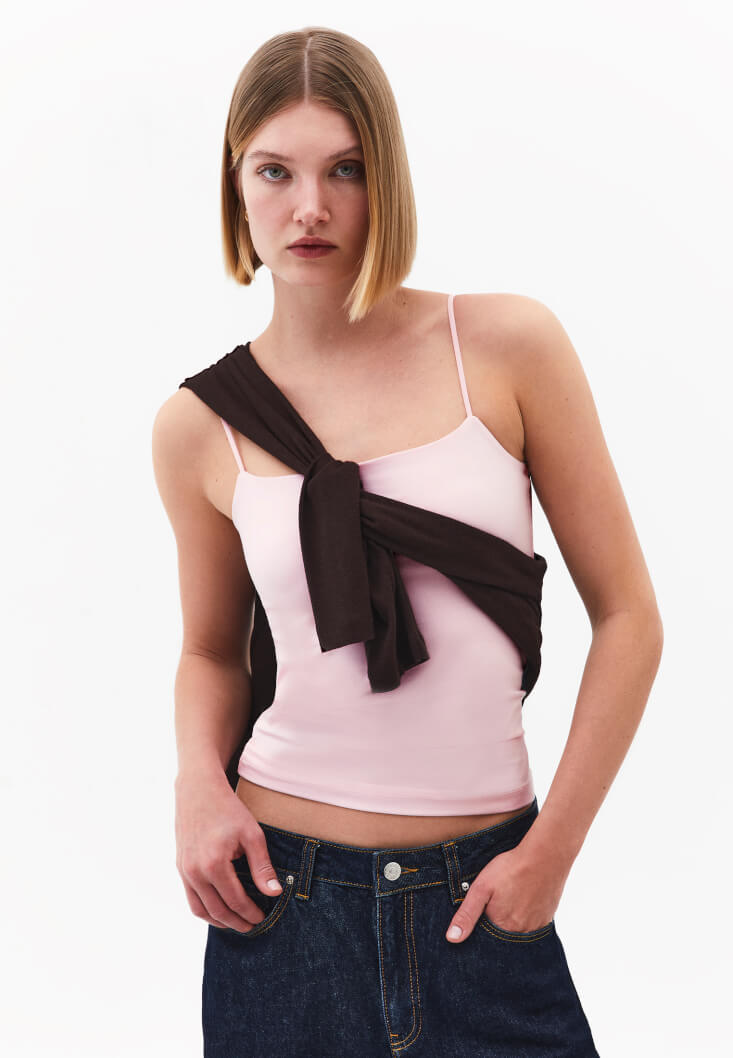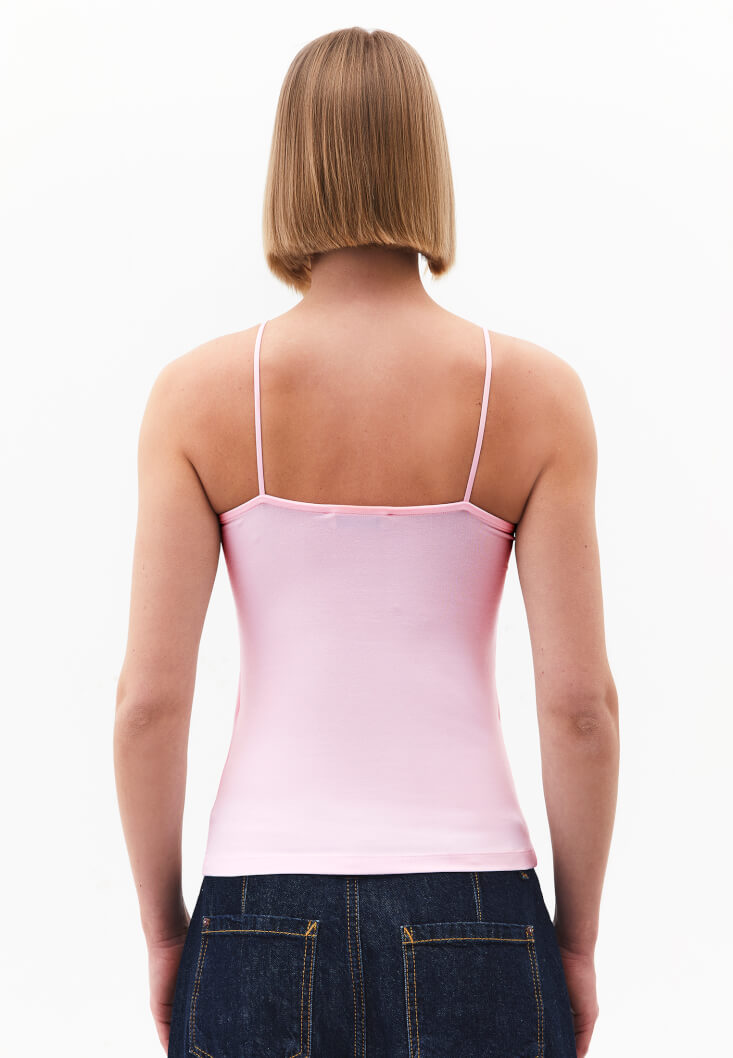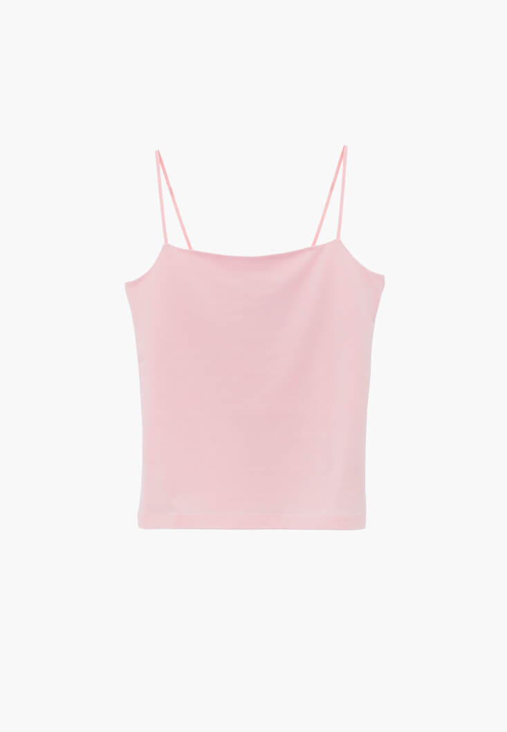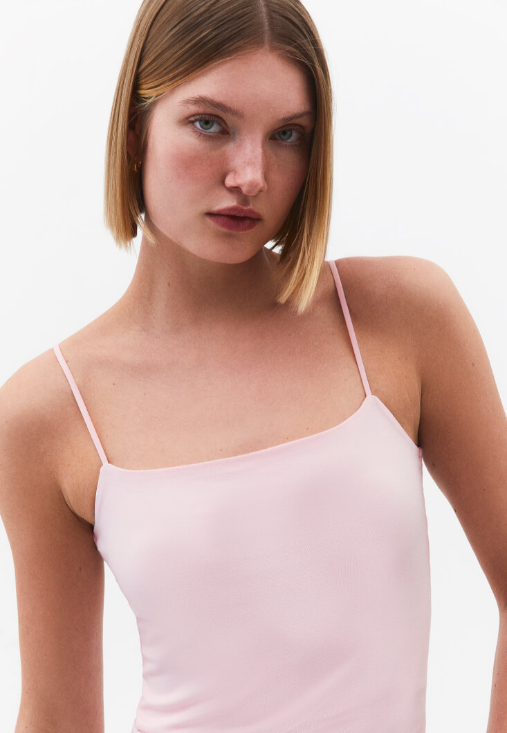 Tencel lifli modal ve pamuk karışımlı içerik, özel yumuşak doku, bedeni saran esnek fit, ince askılı, geniş yaka, göğüs bölümü çift kumaşlı.