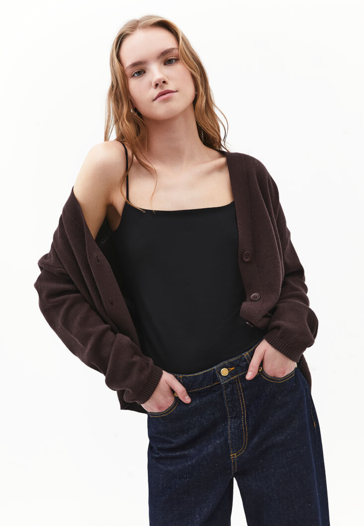 Tencel lifli modal ve pamuk karışımlı içerik, özel yumuşak doku, bedeni saran esnek fit, ince askılı, geniş yaka, göğüs bölümü çift kumaşlı.
