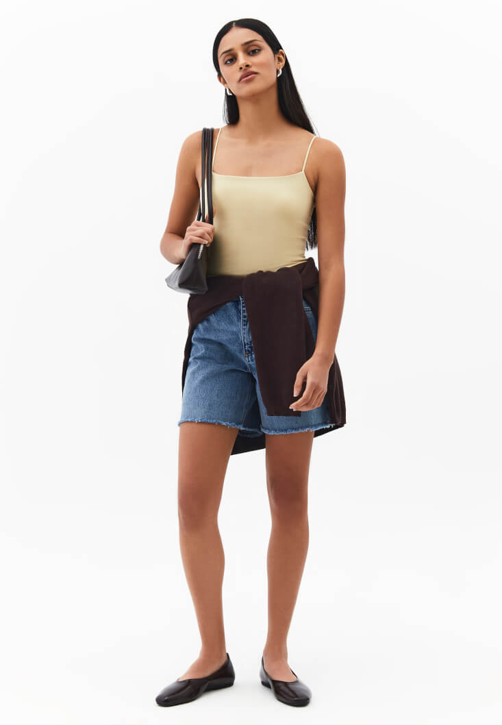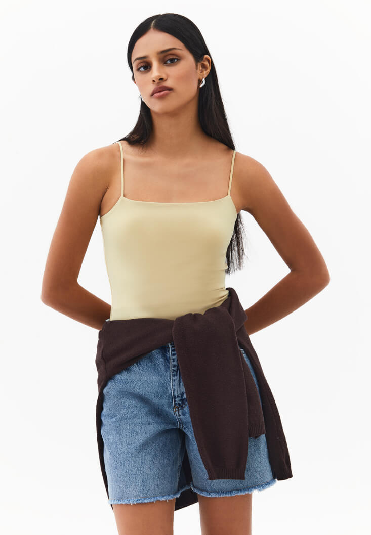 Bu atletin dokusu, vücudu nazikçe sararak gün boyu üstün konfor sağlar. İnce askılı ve klasik kesimi, her türlü üst giyimin altına iz yapmadan giyilebilir; sıcak havalarda ise tek başına minimalist bir şıklık sunar.
