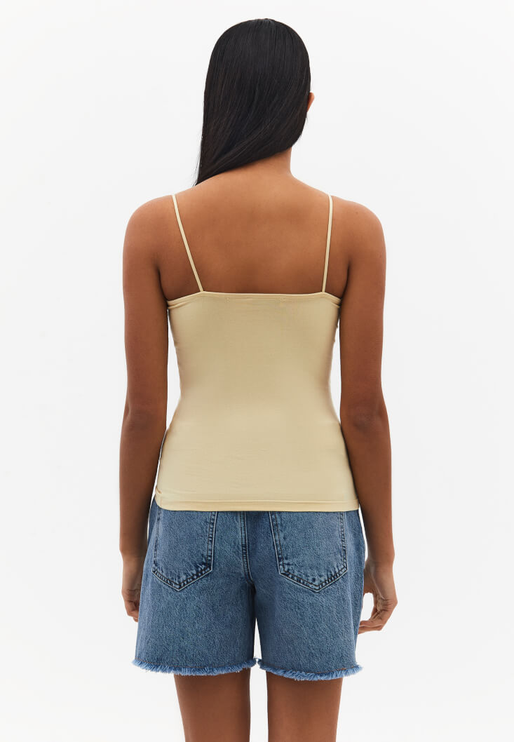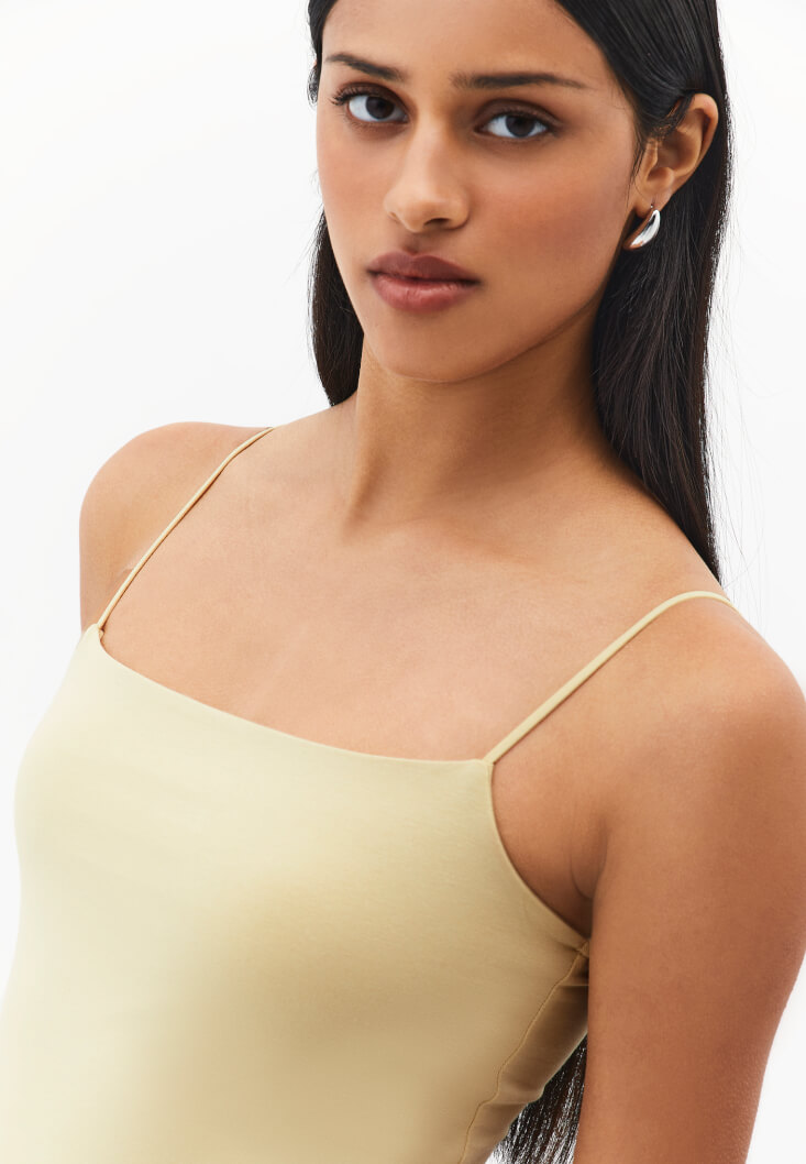 Tencel lifli modal ve pamuk karışımlı içerik, özel yumuşak doku, bedeni saran esnek fit, ince askılı, geniş yaka, göğüs bölümü çift kumaşlı.