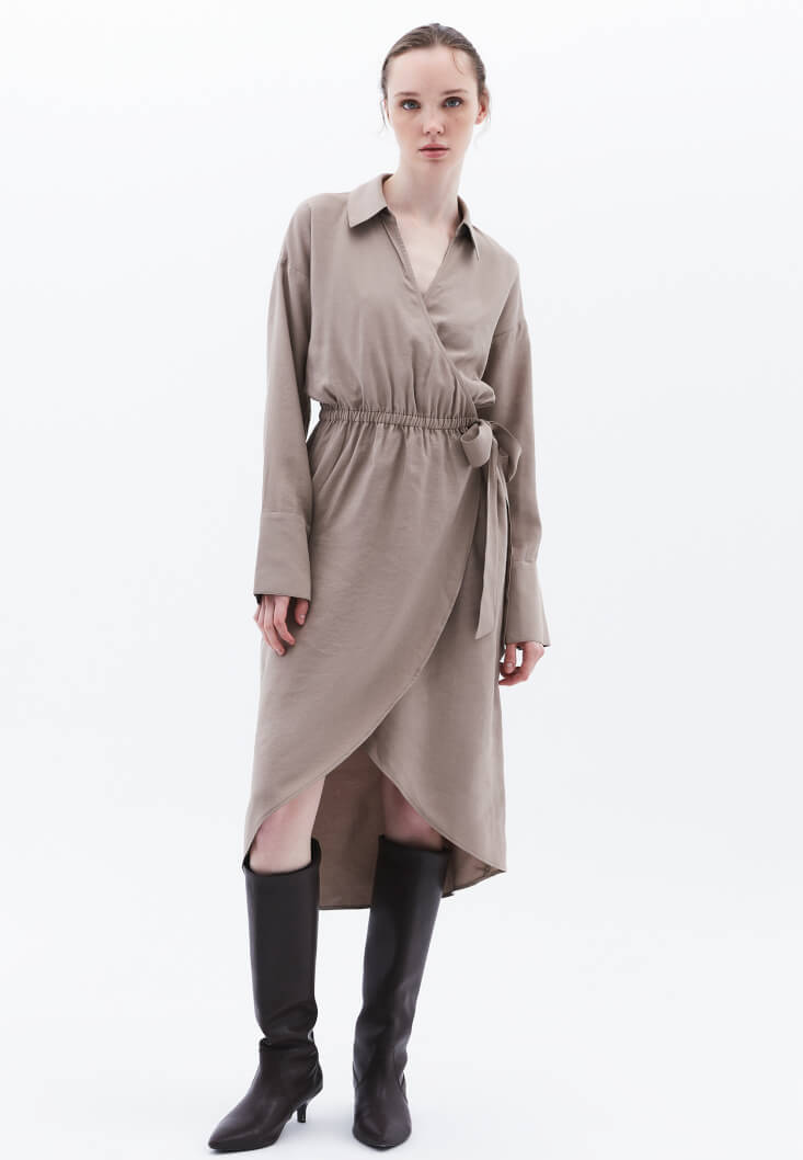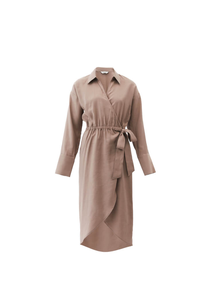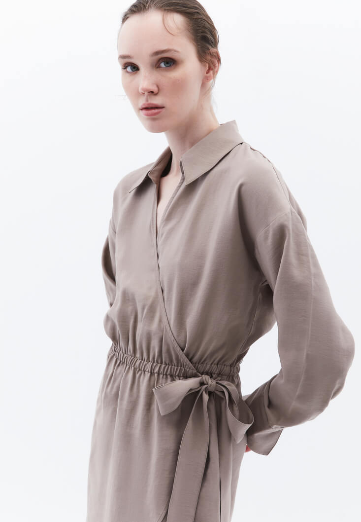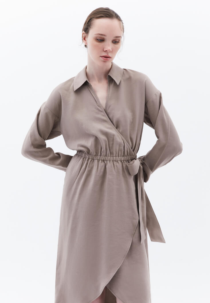 • Bayan Kahverengi Modal Bağlama Detaylı Midi Elbise