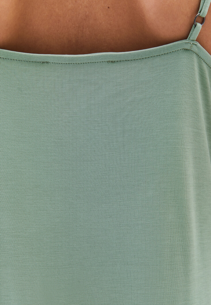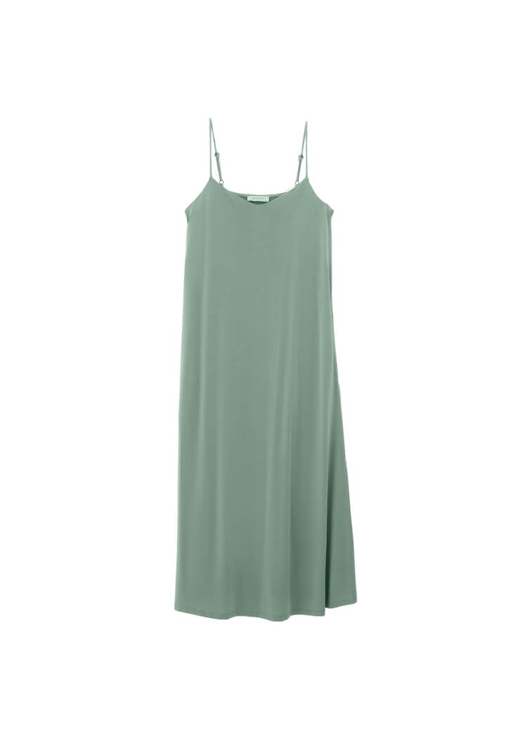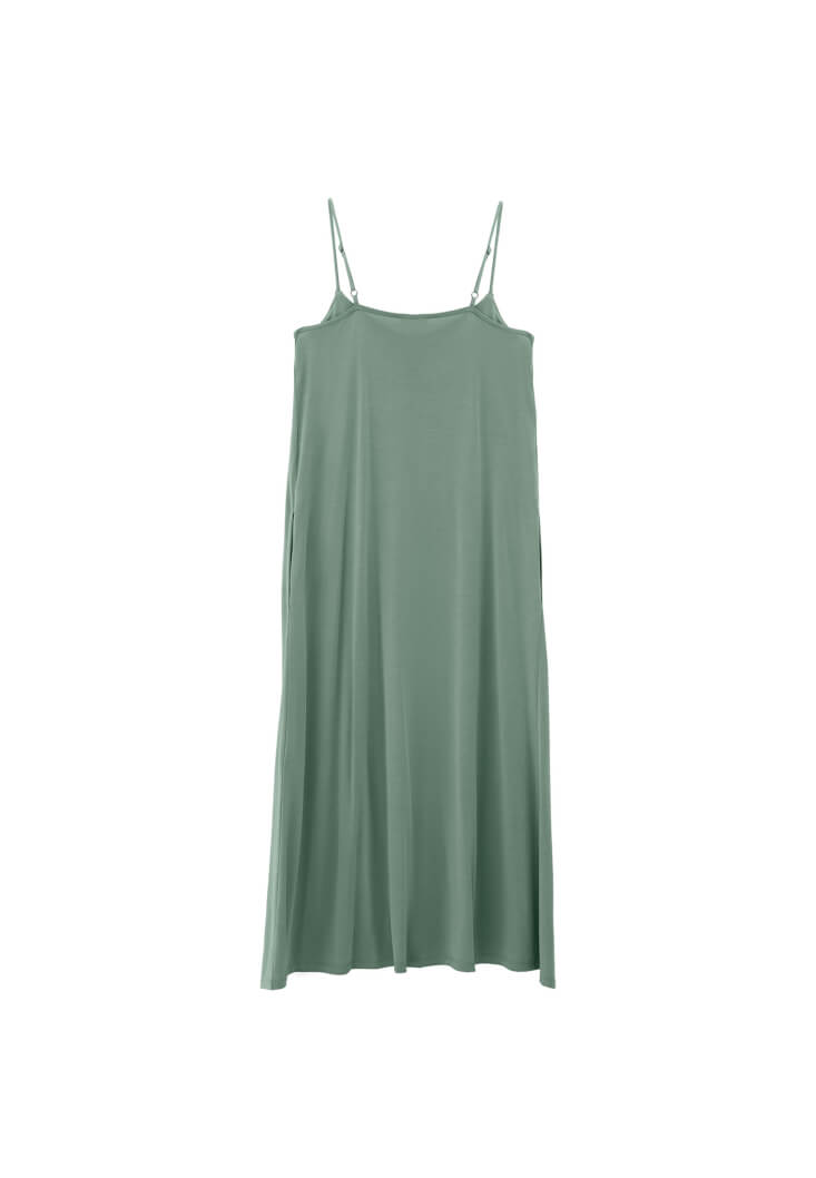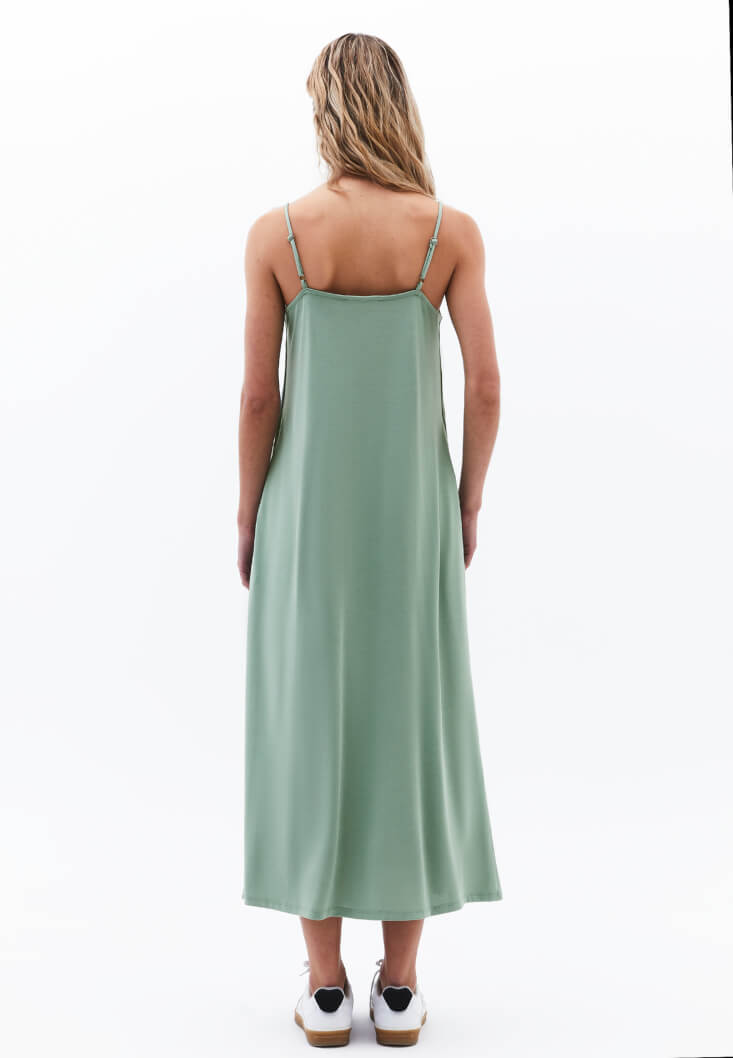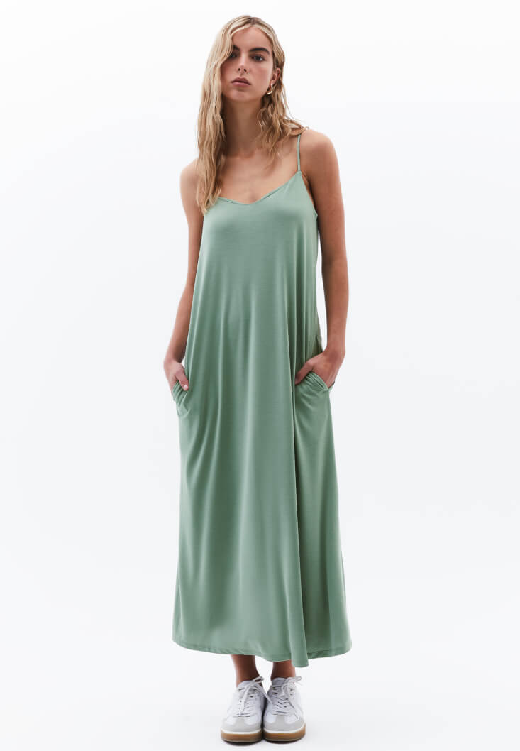 Modal karışımlı ekstra yumuşak doku, A kesim, V yaka, ayarlanabilir ince askılı, iki cepli, bedenden uzak rahat fit, midi boy.