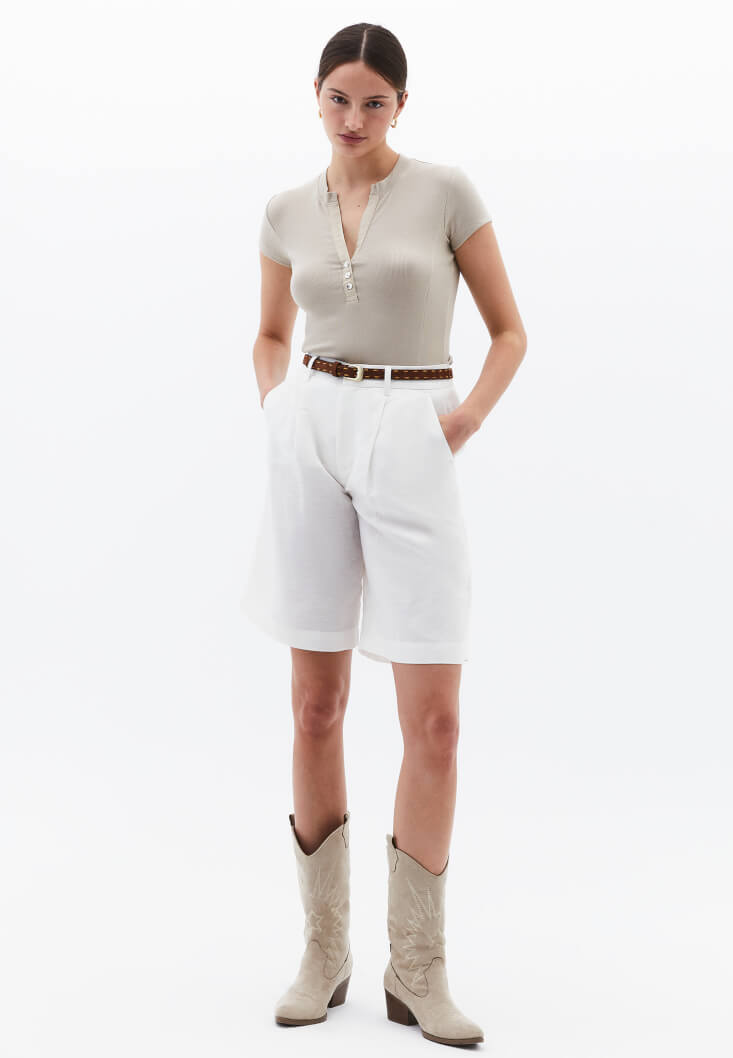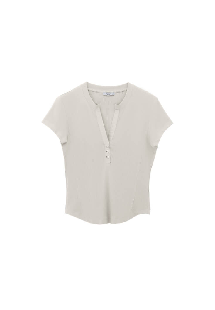Modal ve pamuk karışımlı özel doku, nefes alabilen kumaş yapısı, sıfır yaka, kısa kollu, yakası düğme detaylı, bedene yakın fit.