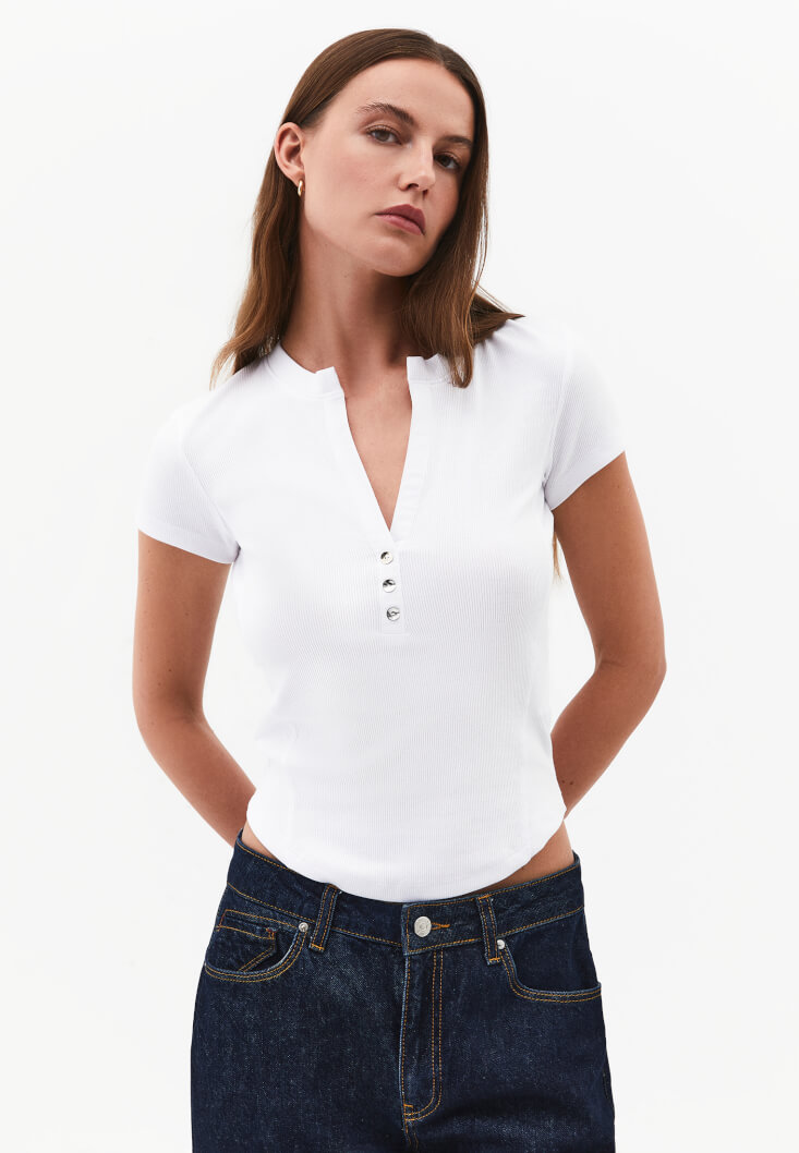 Modal ve pamuk karışımlı özel doku, nefes alabilen kumaş, bedeni saran esnek fit, kısa kollu, düğme detaylı yaka.