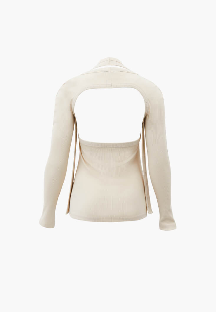 Modal ve pamuk karışımlı özel doku, bedeni saran esnek fit, halter yaka, düğmeleyerek birleştirilip çıkarılabilen bolero parçalı, tek başına kullanılabilen atlet form, sırt dekolteli.