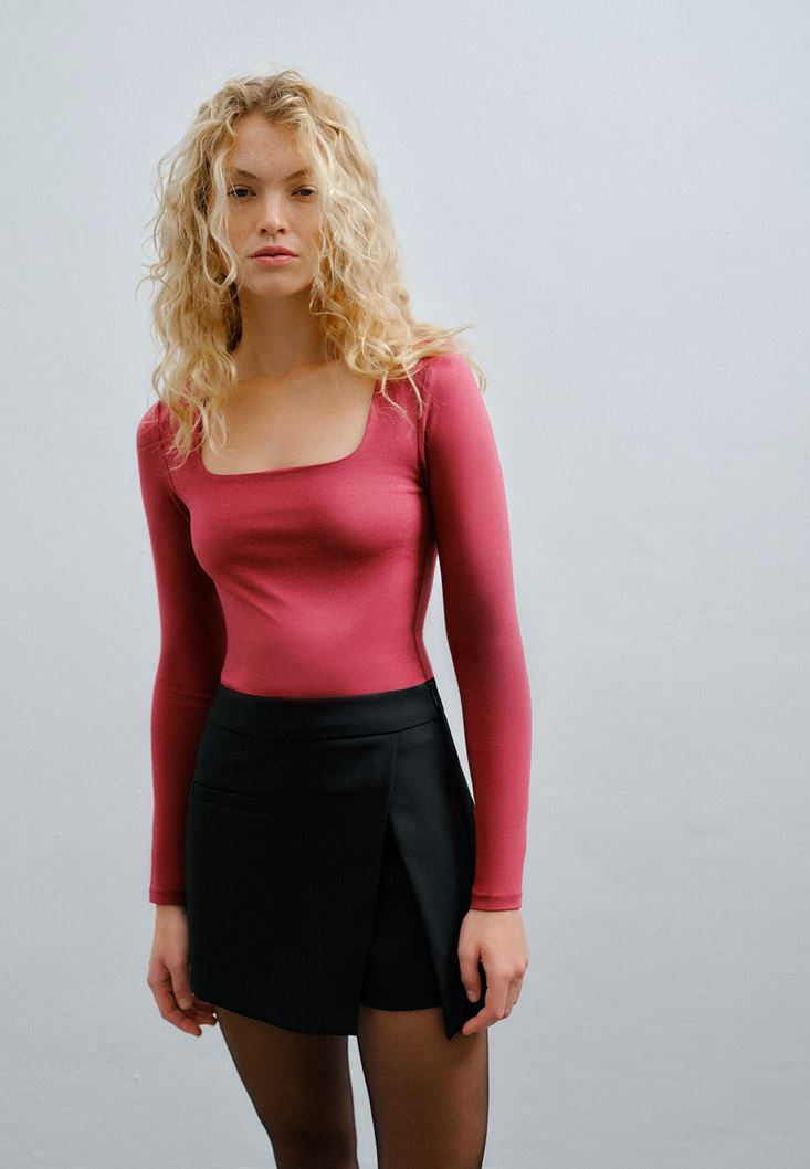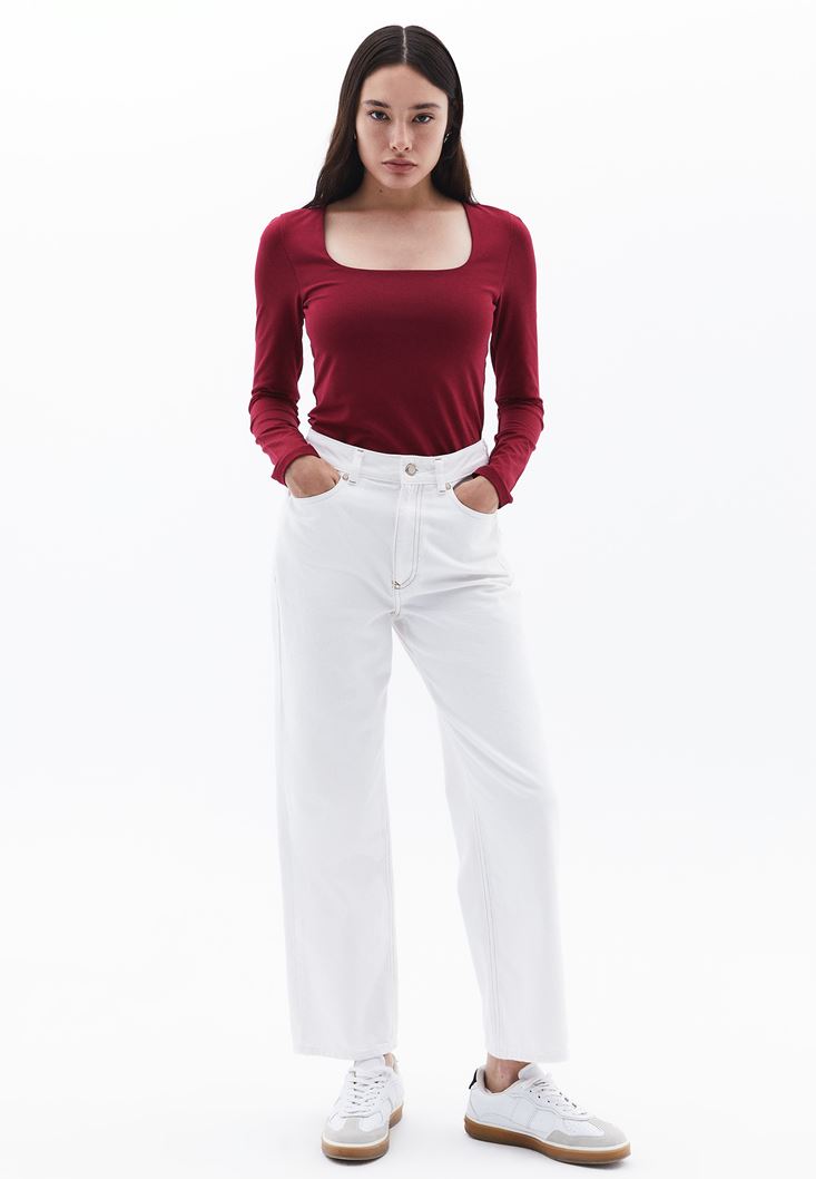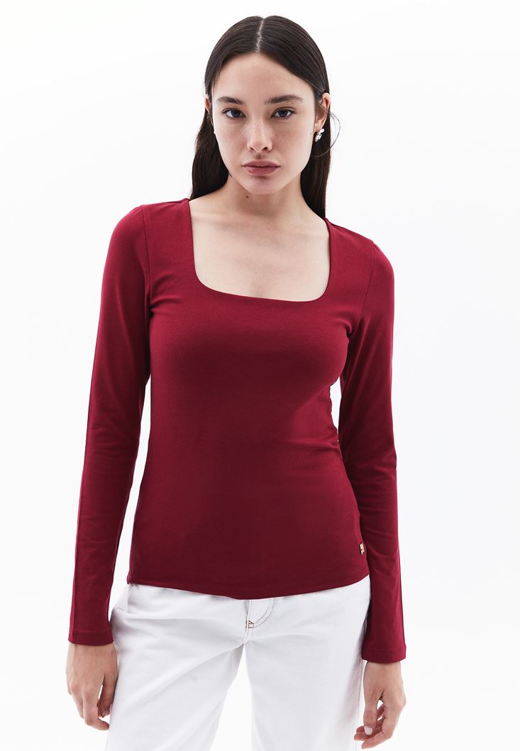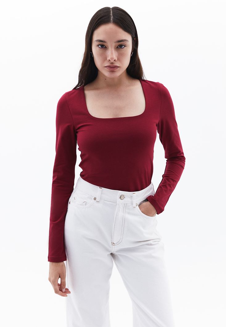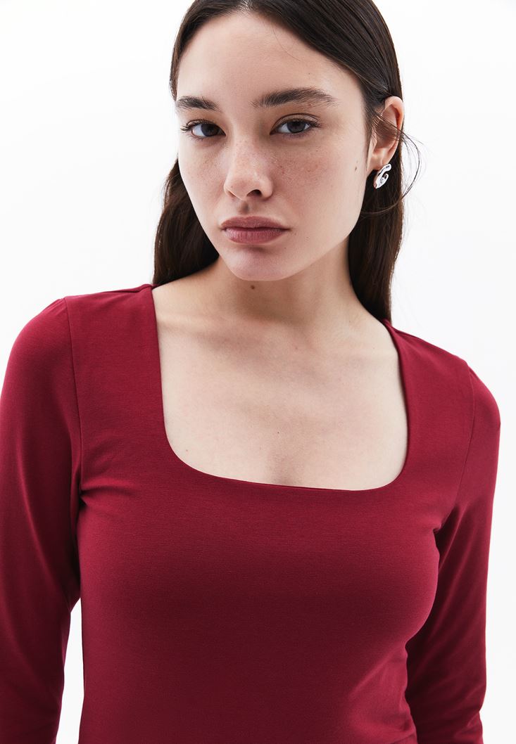 • Bayan Kırmızı Modal Kare Yaka Tişört