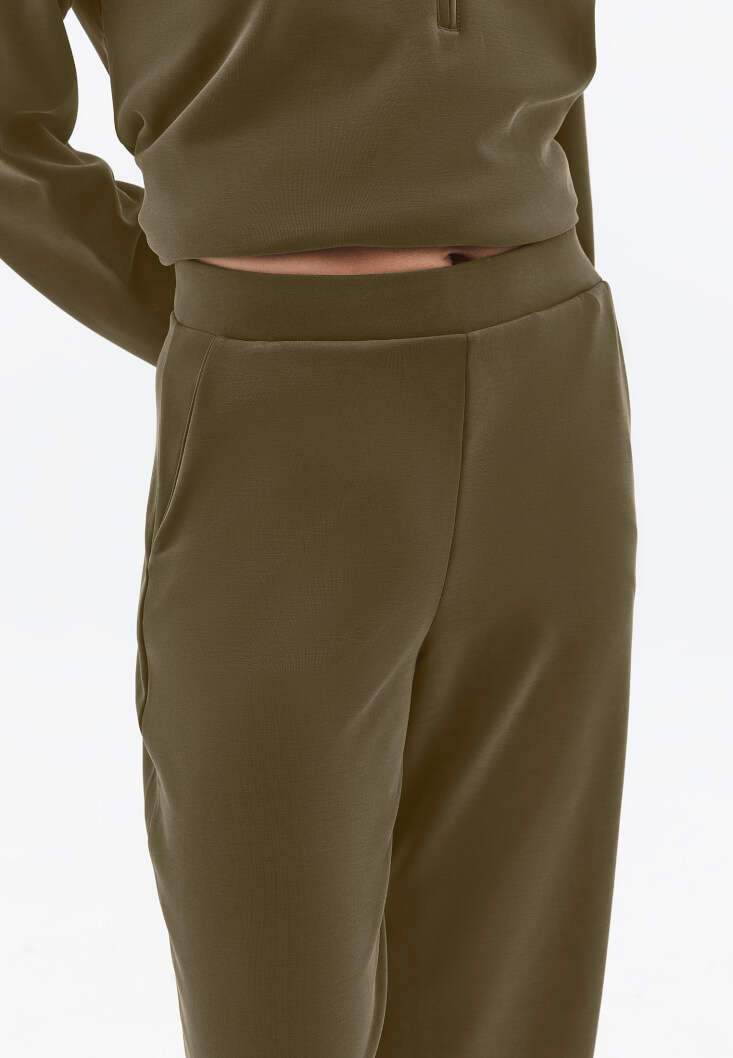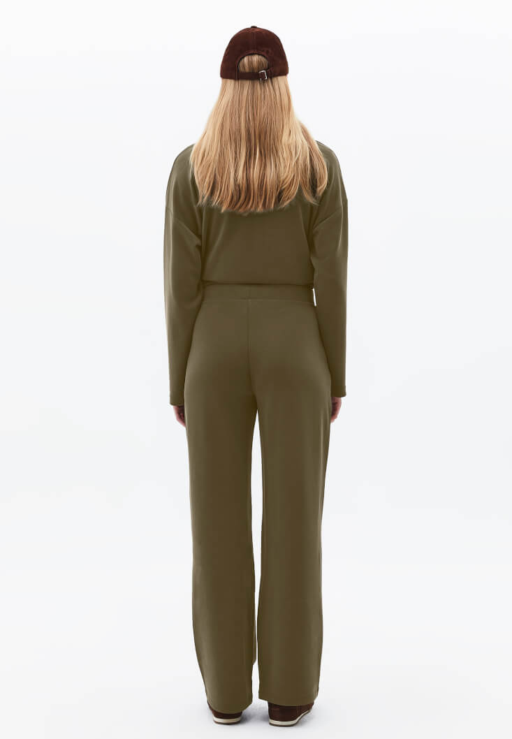 Modal karışımlı ekstra yumuşak doku, hoş dokusuyla hafiflik veren yumuşak tuşe, yüksek bel, straight paça, bedene yakın rahat fit, beli lastikli, iki cepli.