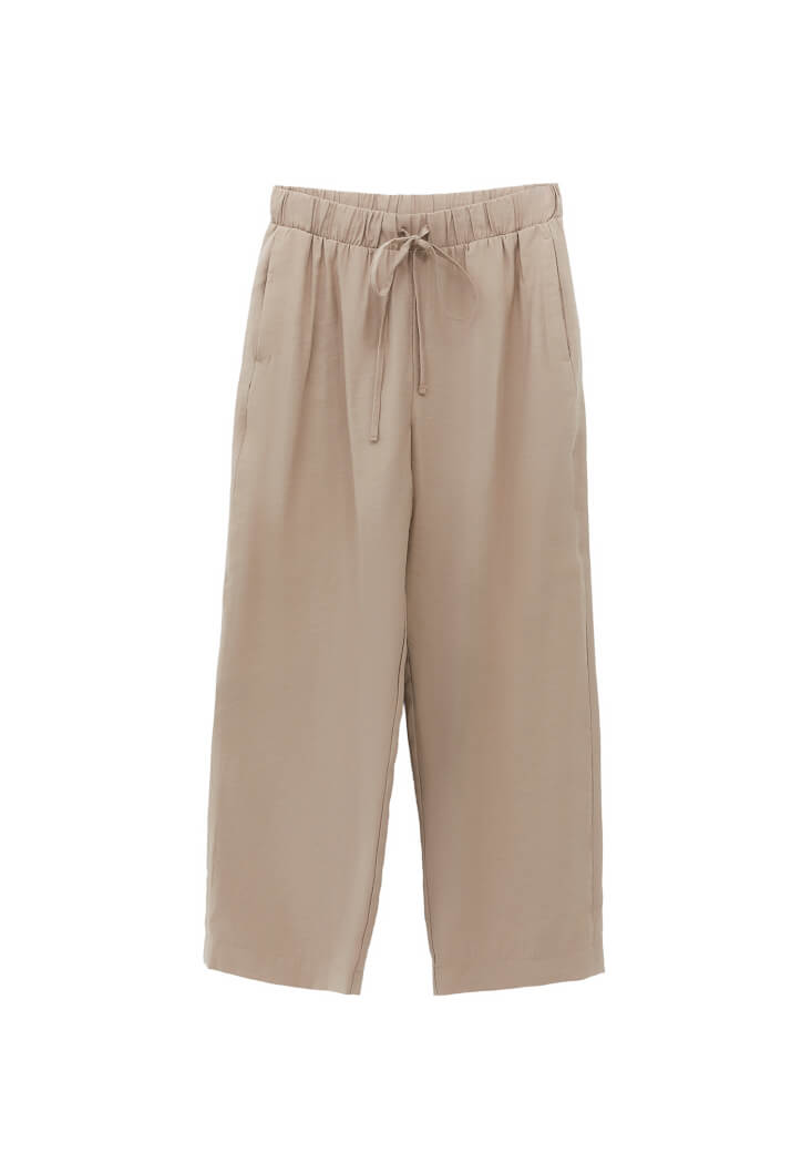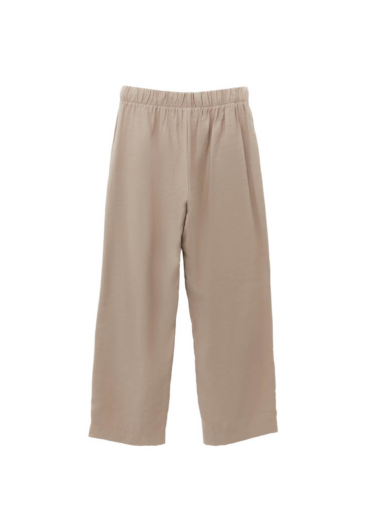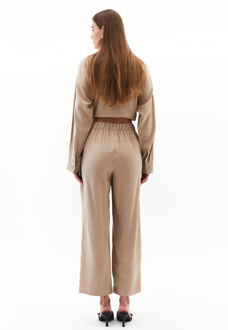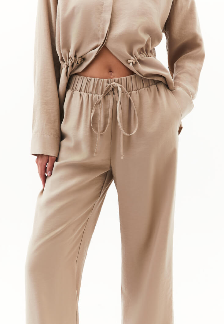 Modal karışımlı özel doku, bedenden uzak rahat fit, yüksek bel, beli lastikli ve bağcıklı, iki cepli, straight paça.