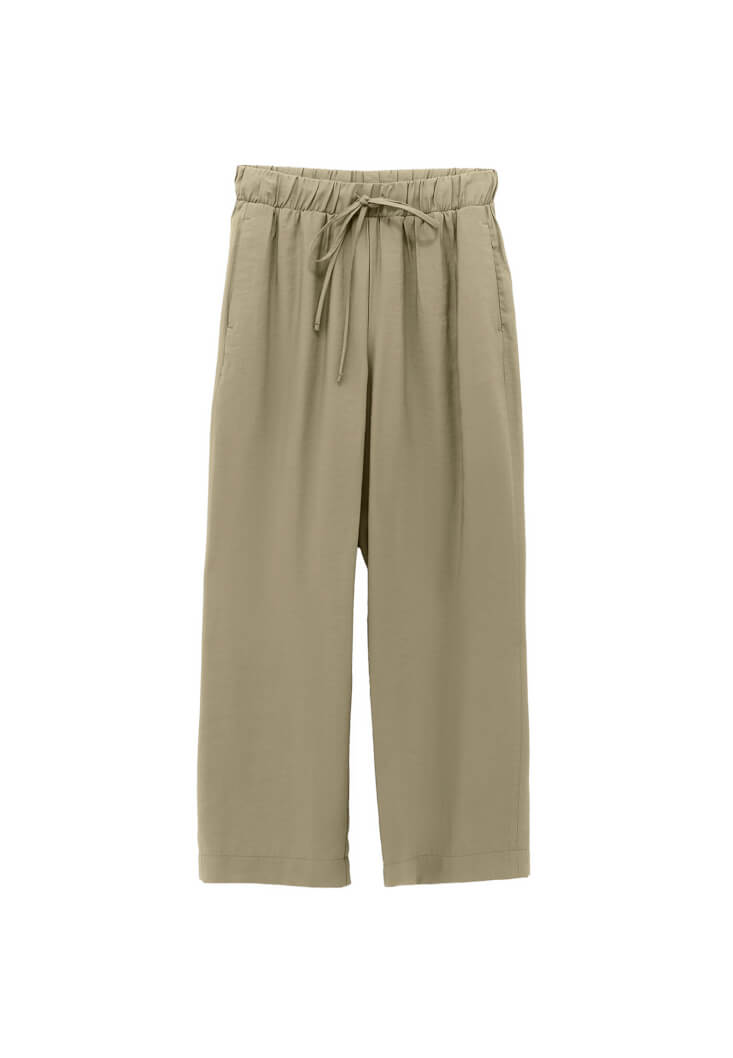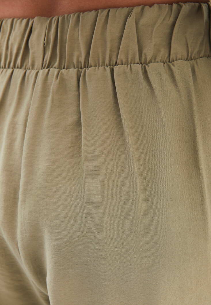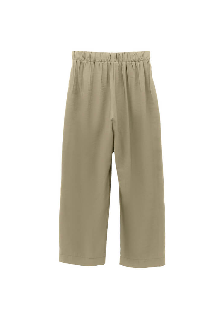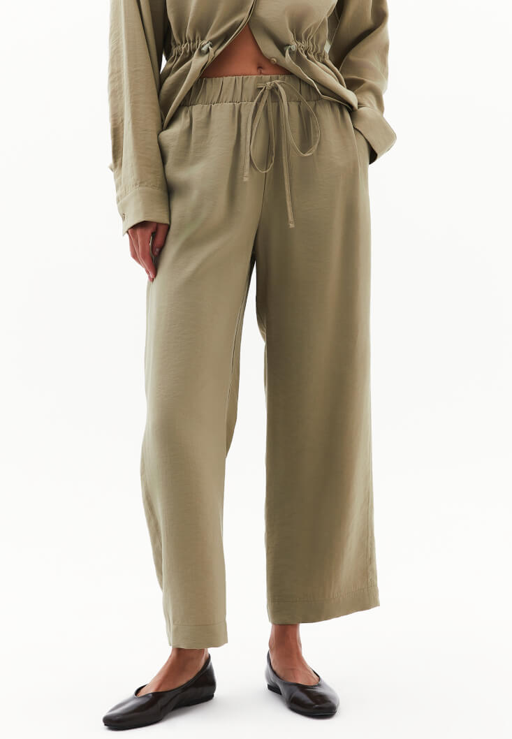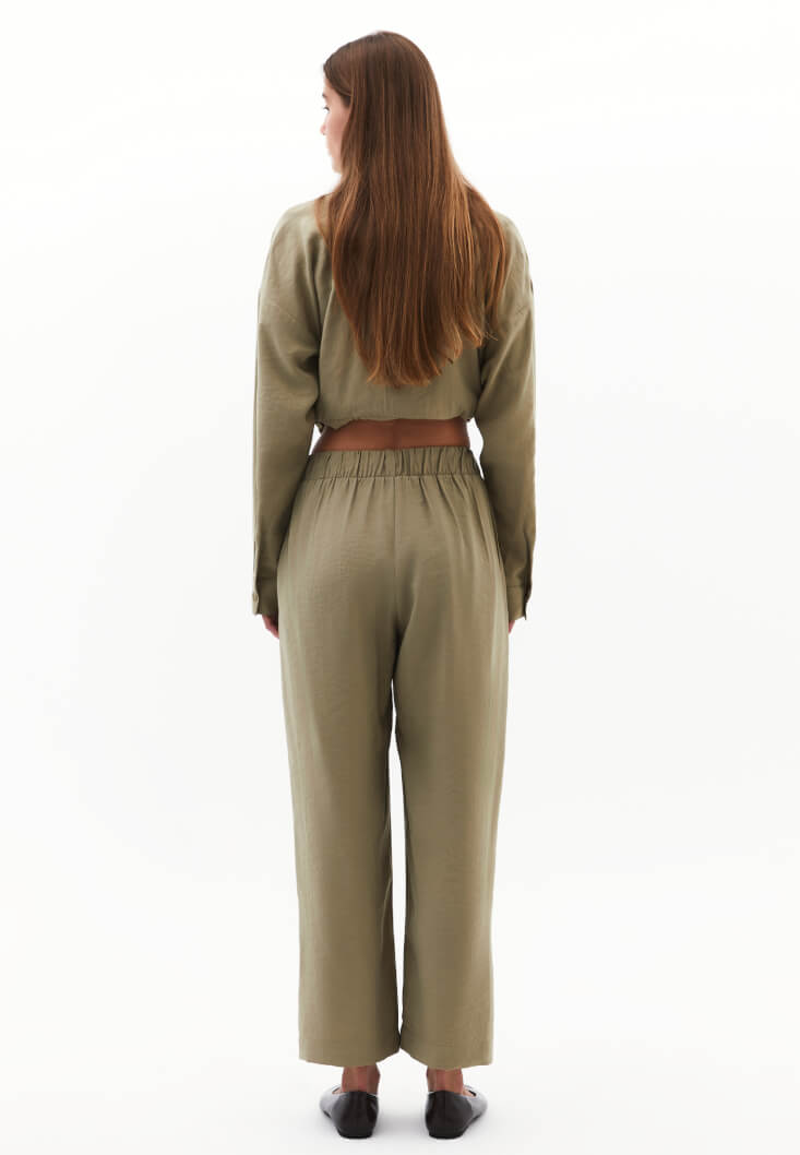 Modal karışımlı özel doku, bedenden uzak rahat fit, yüksek bel, beli lastikli ve bağcıklı, iki cepli, straight paça.
