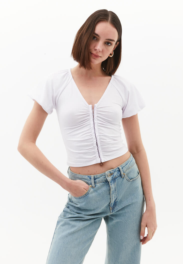 Beyaz Modal V Yaka Bluz