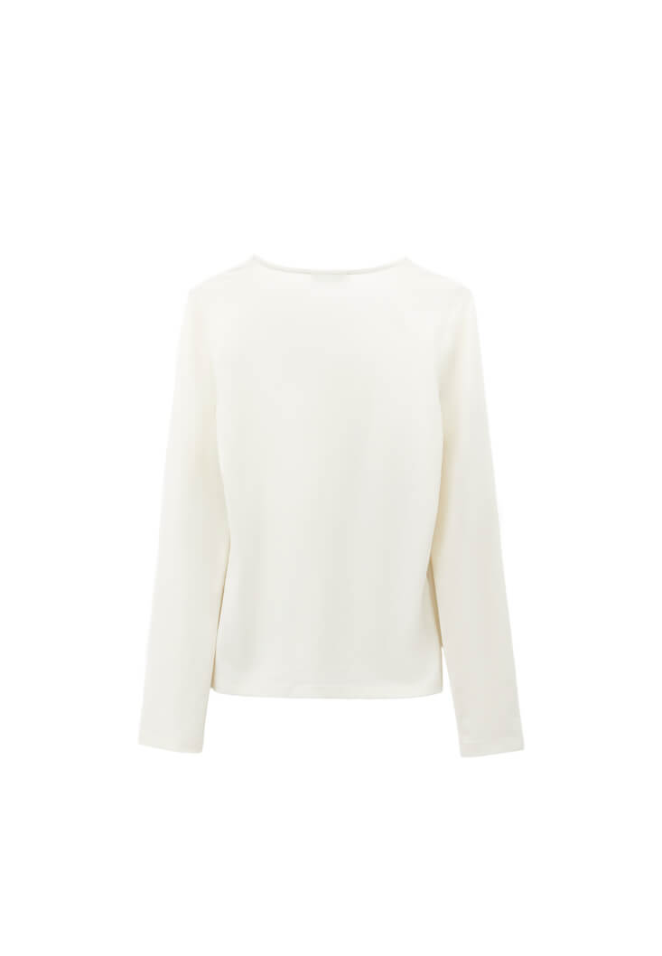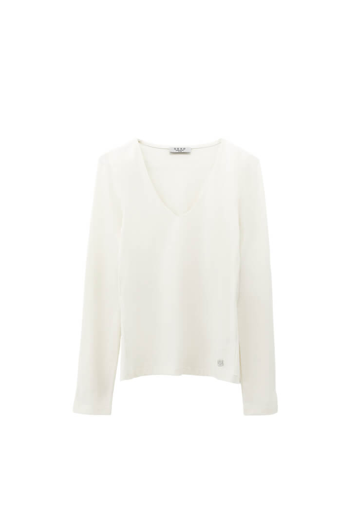Modal ve pamuk karışımlı özel doku, bedeni saran yumuşak kumaş ve esnek fit, uzun kollu, V yaka.