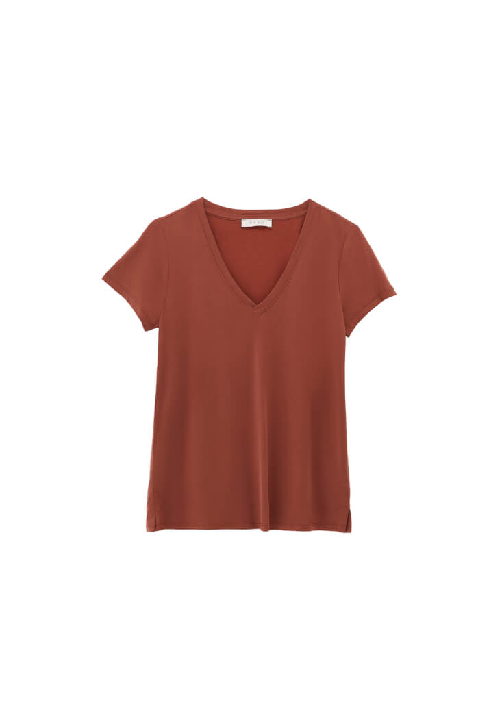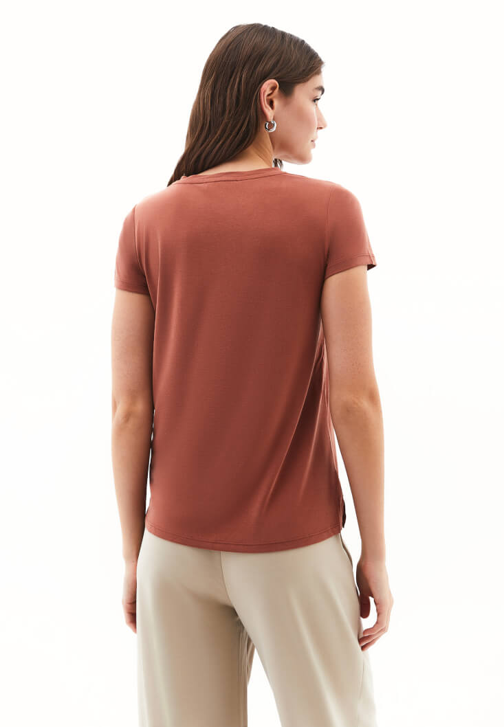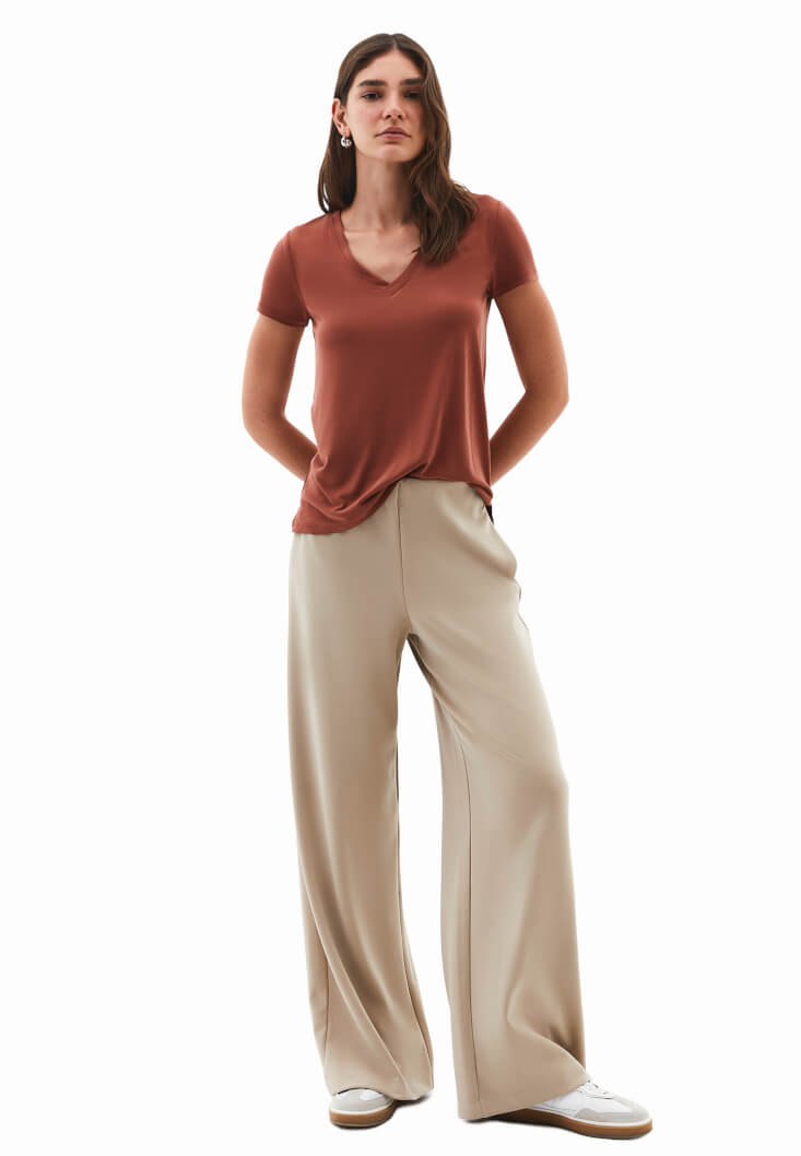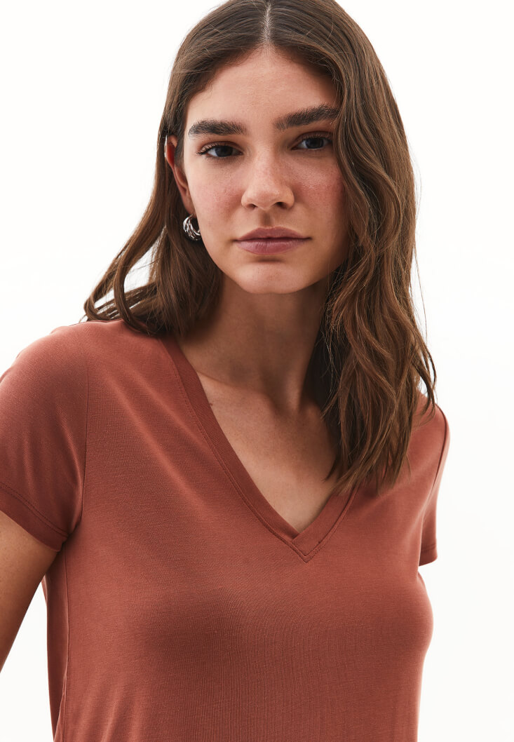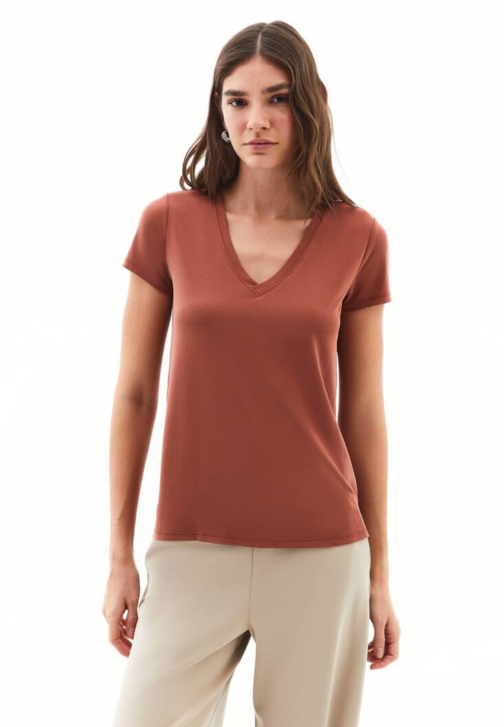 Modal karışımlı ekstra yumuşak doku, bedene yakın rahat fit, kısa kollu, V yaka.