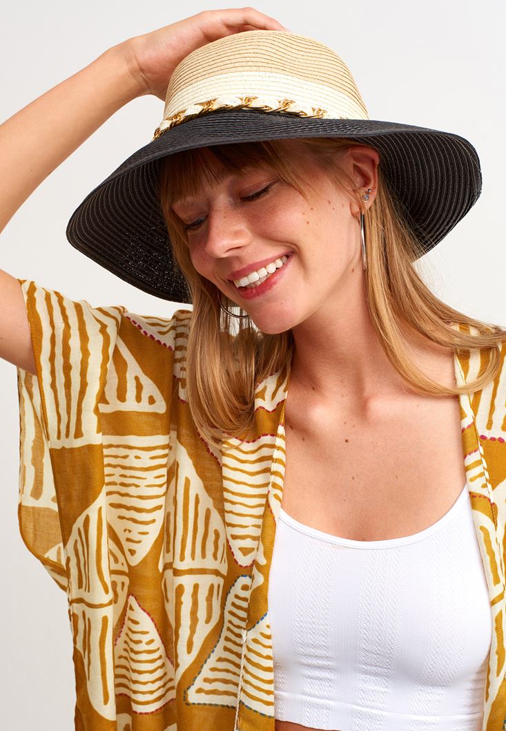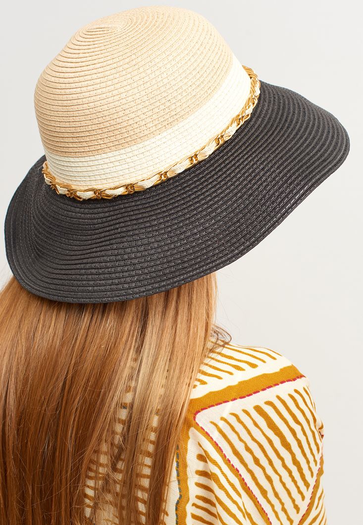 Modern Zincirli Şapka modeli. Yaz aylarının vazgeçilmezi olan şapkalardan biri daha karşında! Dokulu görünüm ve blok renklerden oluşan zincir şapka ile kombinlerin yükselişe geçecek... Güneşli günler için oluşturacağın mini şort ve kimono kombinlerine onu dahil ederek plajda veya arkadaş toplantılarında hoş vakit geçirebilirsin.