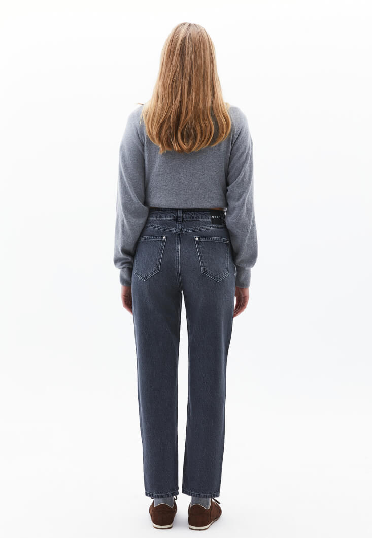 %100 pamuklu denim, bedene yakın rahat fit, yüksek bel, mom fit, önü ve arkası cep detaylı.