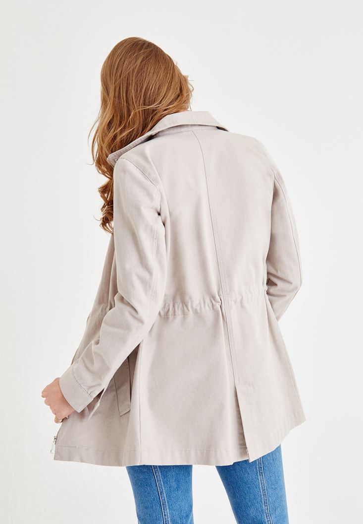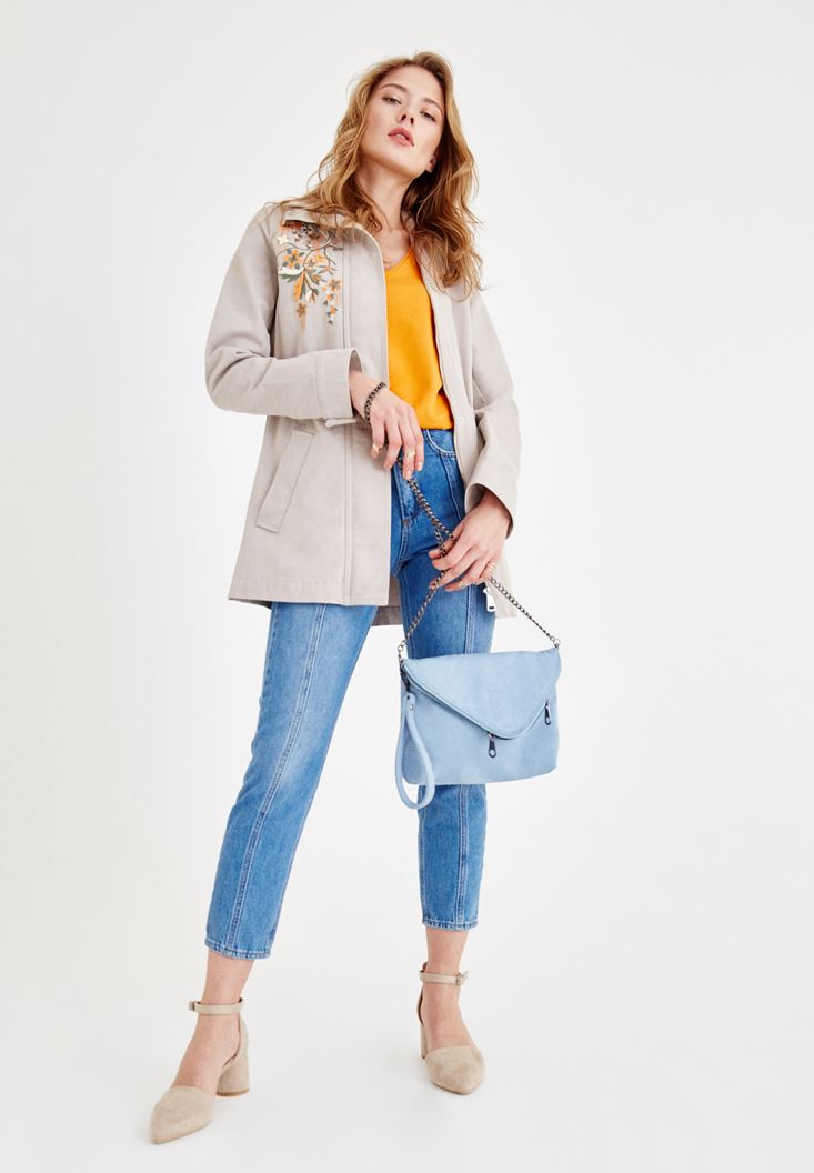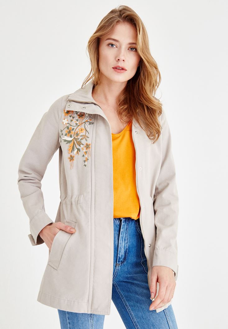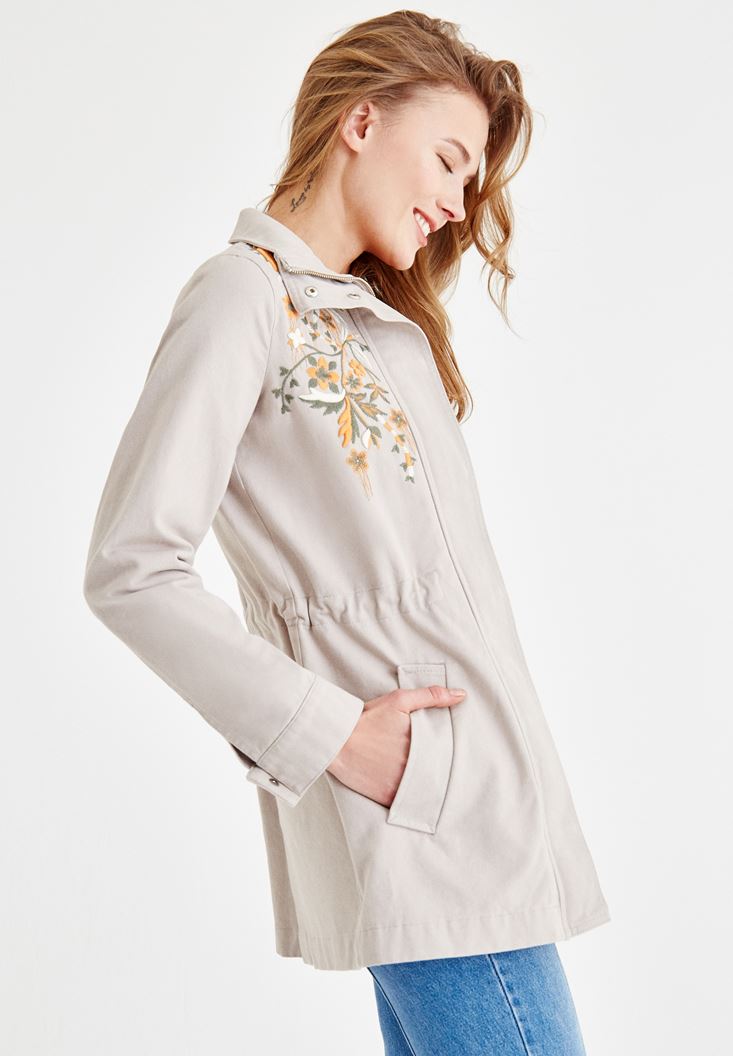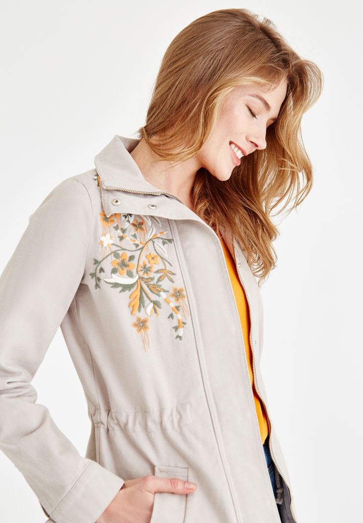 Gri Nakış Detaylı Cepli Ceket